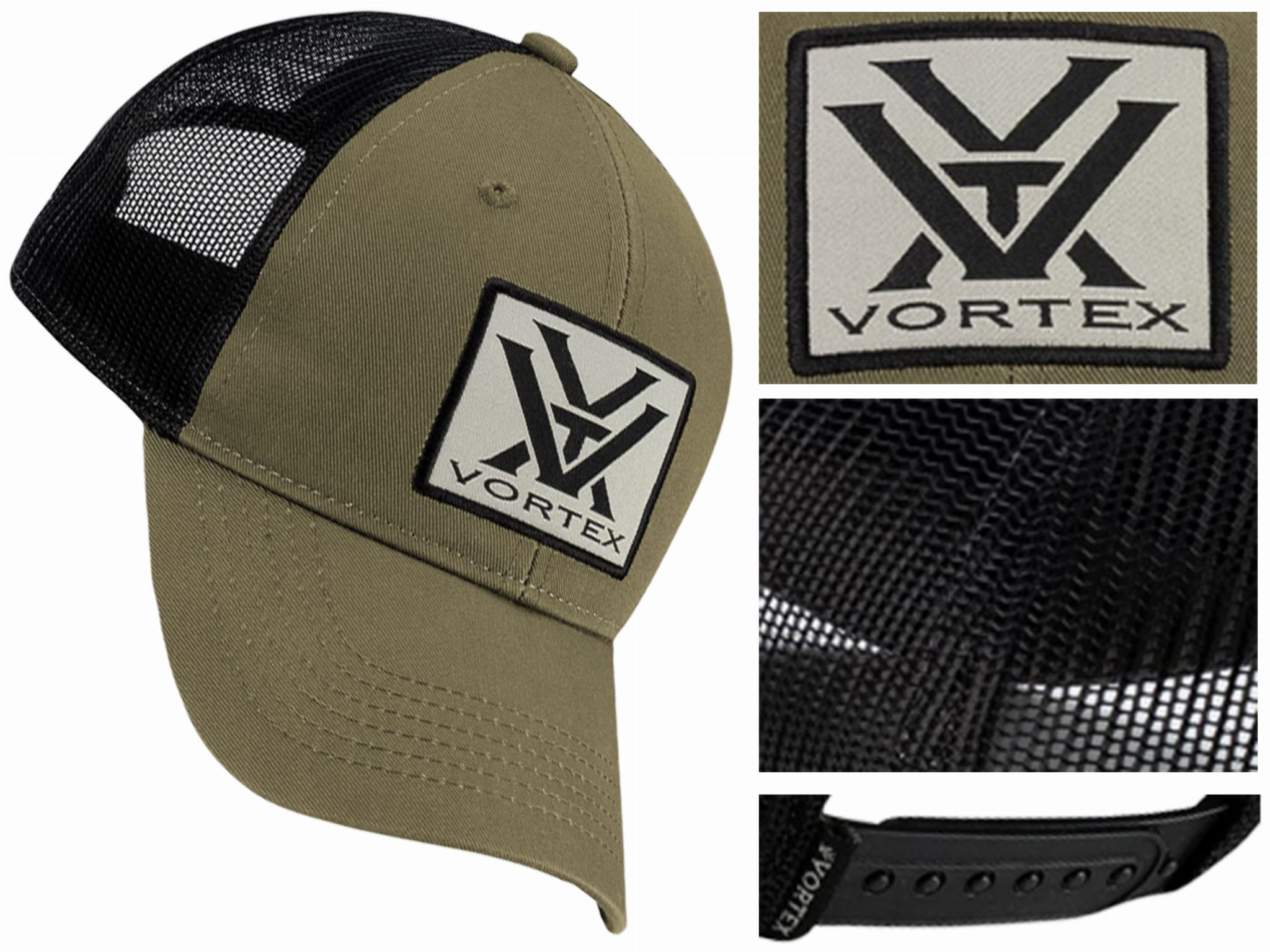 Tylny panel wykonany z drobnej siatki poliestrowej zapewnia wentylację głowy podczas upalnych dni. Na przednim panelu naszyto emblemat z nadrukowanym logo Vortex.