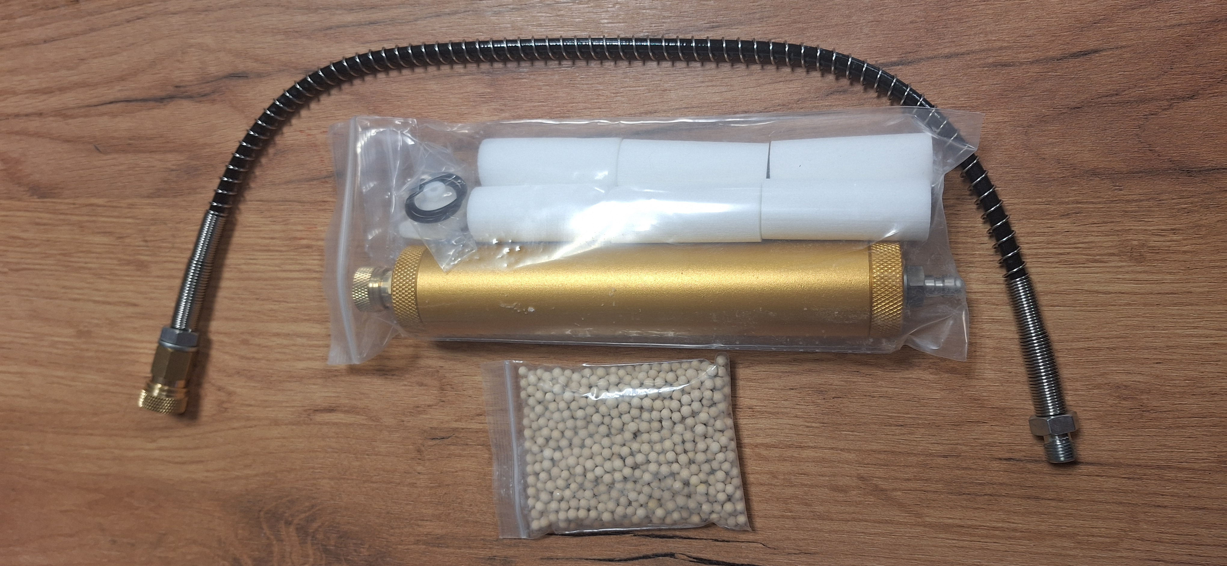 Filtr do kompresora PCP. Zawiera wkłady, granulat, wężyk dzięki czemu, w łatwy sposób można połączyć i wyprowadzić filtr.