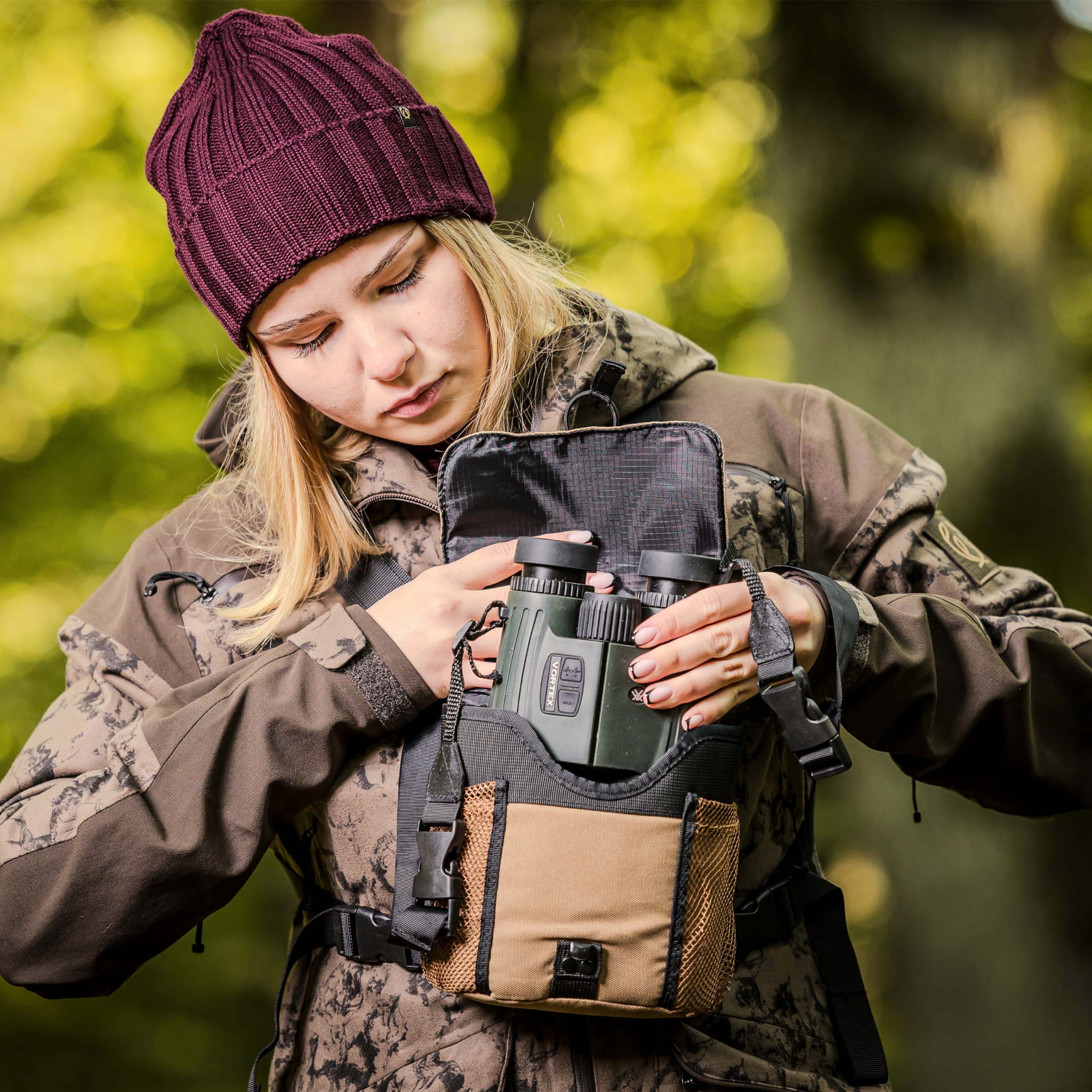 - przyciski po prawej stronie - przyciskie umieszczone w ten sposób pozwalają na sterowanie funkcjami dalmierza i trzymanie lornetki jedną ręką.