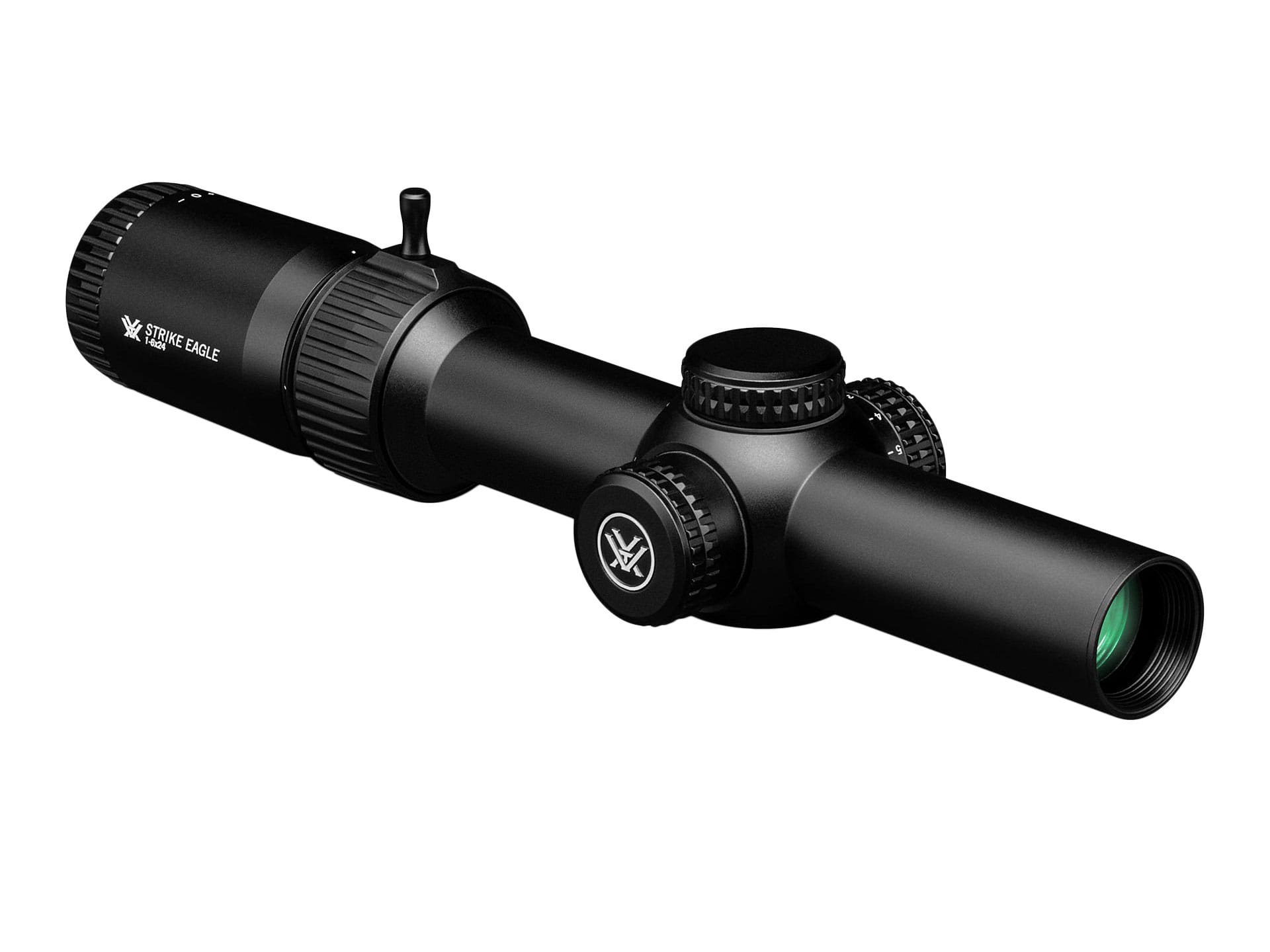 Vortex Strike Eagle 1-6x24 to uniwersalna luneta myśliwsko-sportowa z podświetlaną siatką celowniczą AR-BDC3 w drugim planie oraz dźwignią szybkiej regulacji przybliżenia.