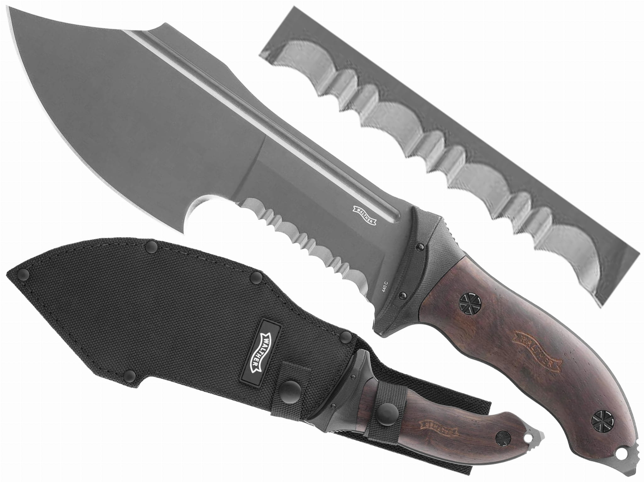 Gładkie ostrze na przodzie klingi świetnie sprawdzi się do karczowania i rąbania drewna. Ząbkowane ostrze poradzi sobie z cięciem włóknistego i twardego materiału, a hak idealnie sprawdzi się do podcinania korzenia i gałęzi. Wzdłuż całej klingi biegnie zbrocze (wgłębienie), które zmniejsza ciężar oraz pełni funkcję dekoracyjną. Dzięki takiej funkcjonalności Walther FTK XXL jest pełnowartościowym narzędziem do pracy w terenie, które sprosta nawet najcięższym zadaniom.