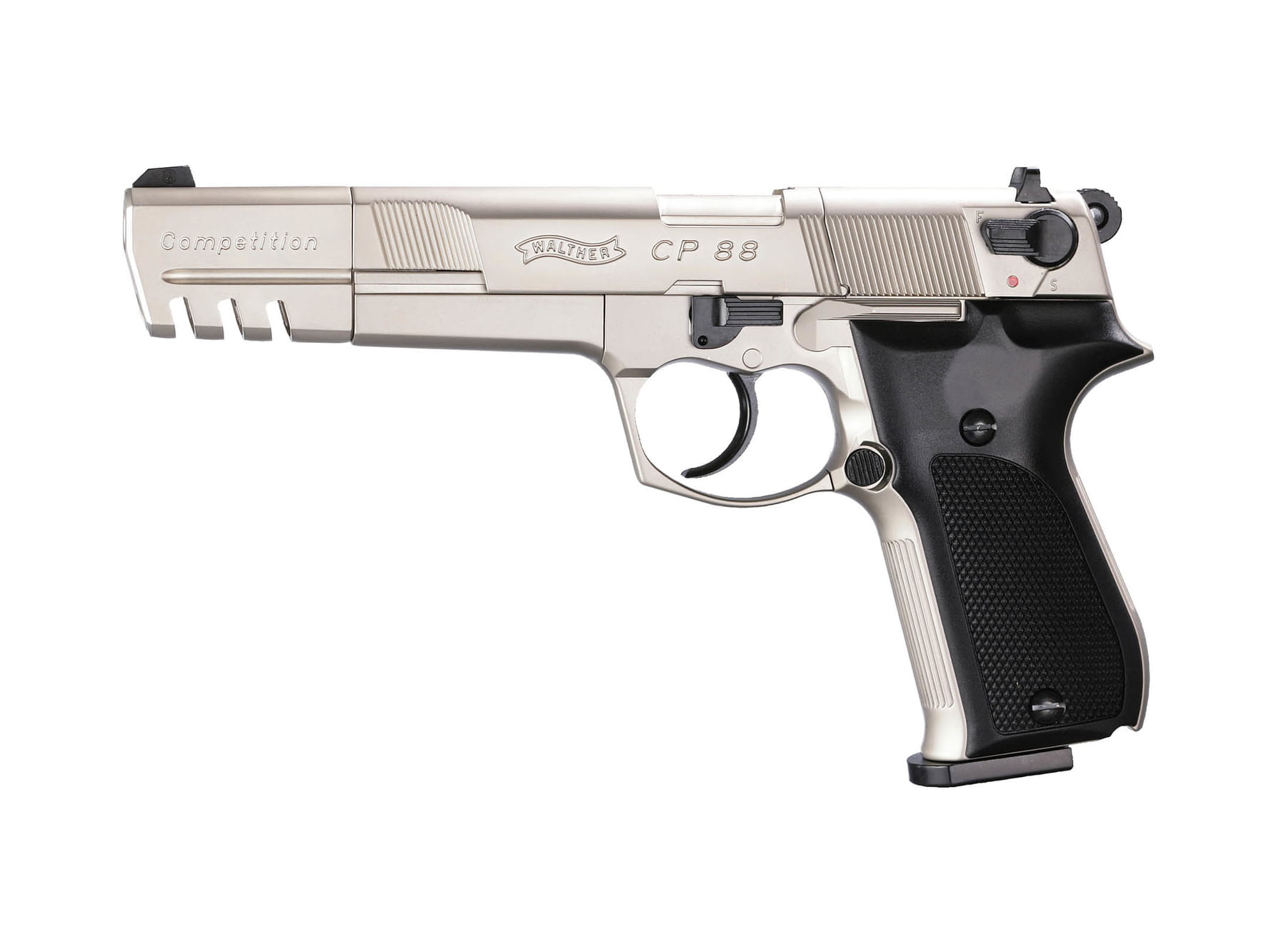 Walther CP88 w wersji Competition został wyposażony w dłużsżą 5,5" lufę oraz kompensator, które zapewniają lepsza celność oraz nadają wiatrówce sportowego charakteru. Pistolet ma efektowne wykończenie techniką niklowania.