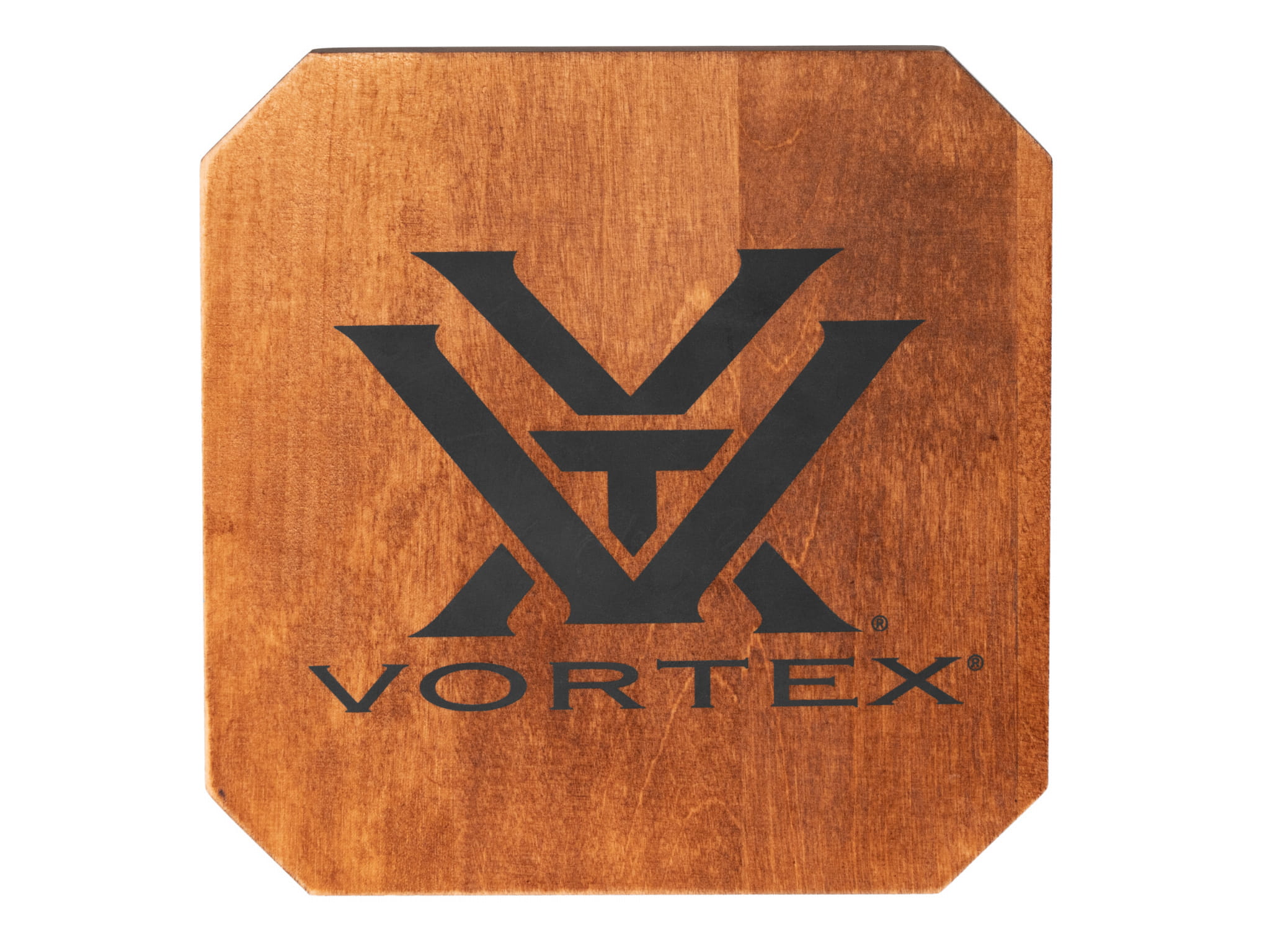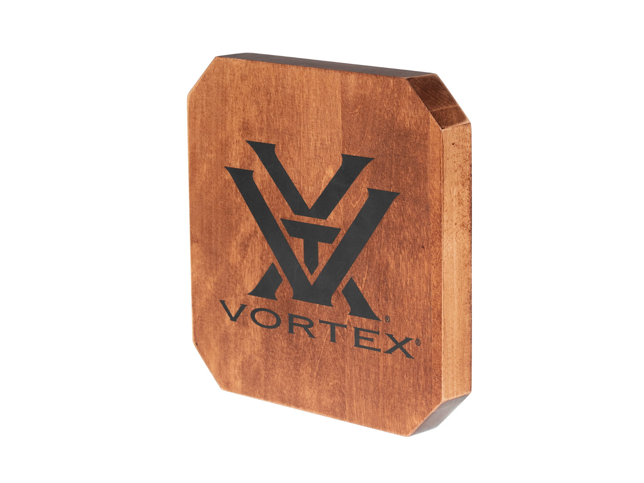 Drewniany blok z logo Vortex może pełnić funkcję samodzielnej reklamy lub efektownej podstawy pod mniejszy produkt.