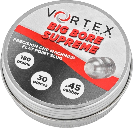 Vortex Big Bore Supreme .45 (180 gr) niezwykle precyzyjny, ciężki śrut typu Slug Hollow Point (grzybkujący) amerykańskiej marki Hatsan USA w kalibrze 11.43 mm. Proces produkcji metodą frezowania CNC zapewnia celność oraz powtarzalność nieosiągalną dla konkurencyjnych śrutów wytwarzanych za pomocą odlewania bądź tłoczenia - każda indywidualna śrucina obrabiana jest komputerowo, dzięki czemu wszystkie są wykonane dokładnie tak samo, z dokładnością do setnych części milimetra, bez nadlewek, porów i innych defektów od formy. Zaprojektowany do precyzyjnego strzelania na na średnich i dalekich dystansach oraz do polowań na szkodniki. Uszczelnione metalowe pudełko, 30 sztuk.
