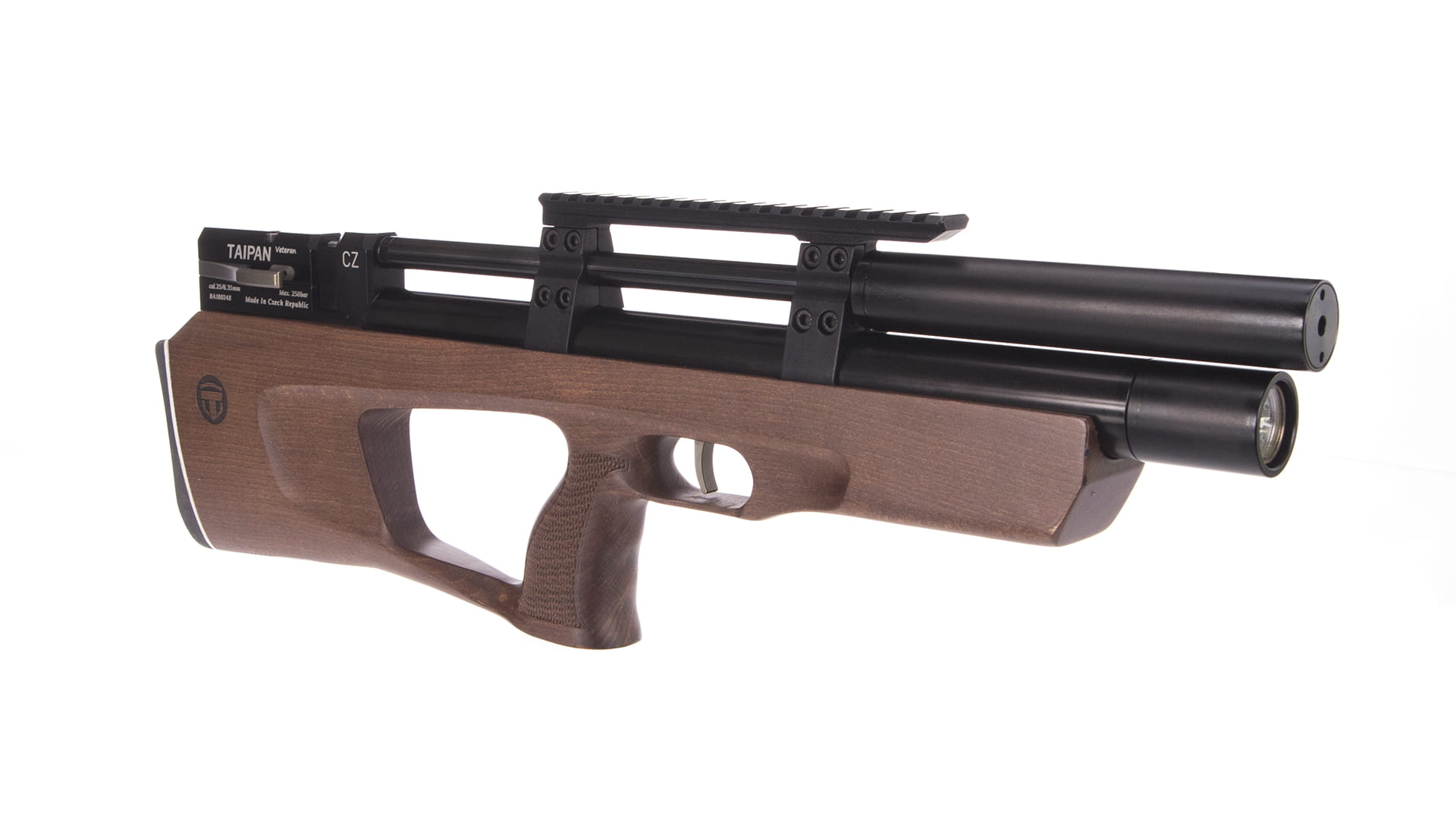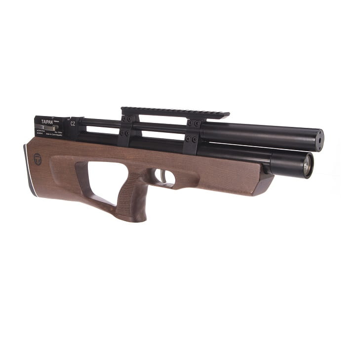 Taipan Veteran klasyfikuje się do wiatrówek typu bullpup, które obecnie cieszą się dużą popularnością w środowisku wiatrówkowiczów. Każdy wchodzący w skład konstrukcji element odznacza się wysoką jakością i precyzją wykonania, dzięki czemu wiatrówka jest w stanie przewyższyć konkurencyjne modele w swoim segmencie. W zestawie znajdziemy dwa magazynki, wkładkę jednostrzałową oraz adapter quickfill.