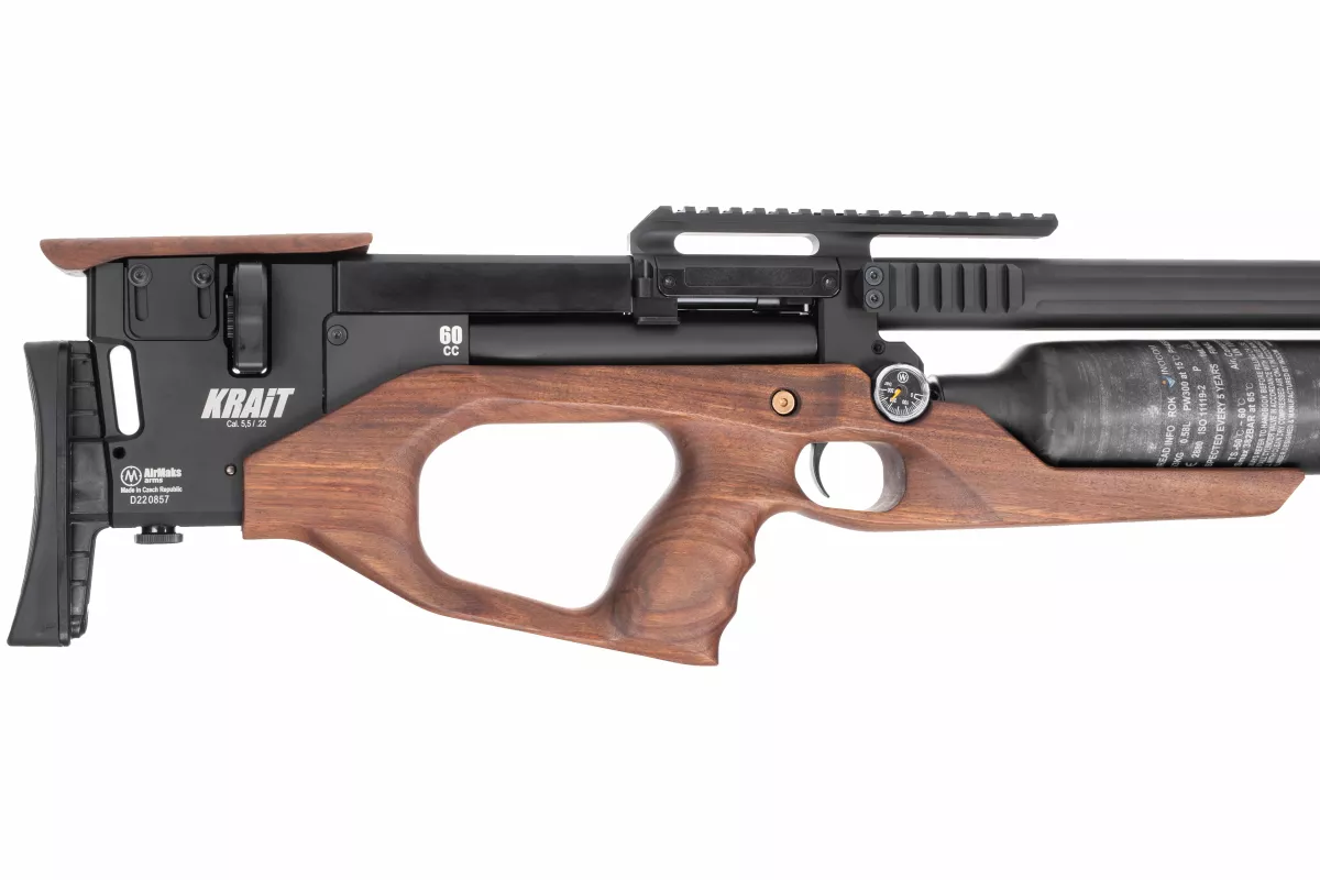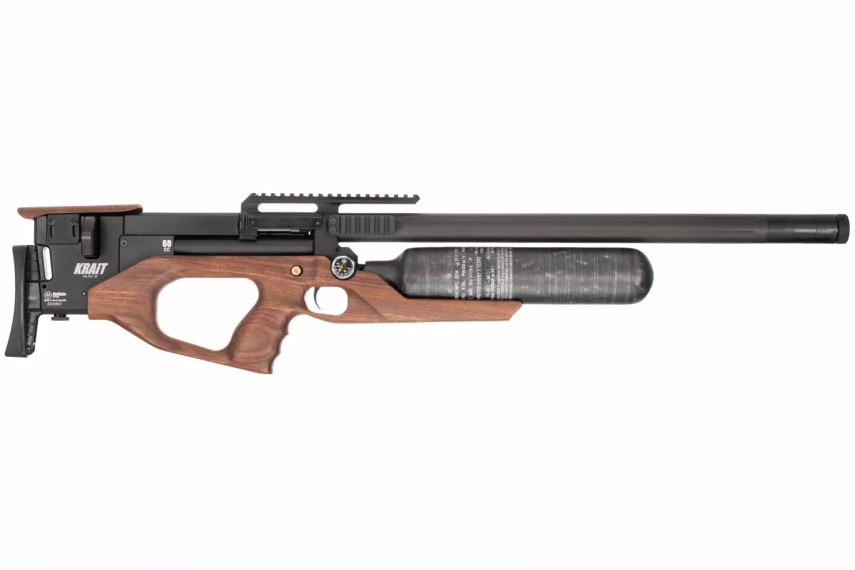Tym razem kolejnym nabytkiem w rodzinie kompaktowych bullpupów jest model o nazwie Krait WX 5,5 mm. Ta unikalna wersja odróżnia się już na pierwszy rzut oka swoją stylową drewnianą kolbą o ładnych liniach. Również kartusz przeszedł modyfikację - jego pojemność została zwiększona do imponujących 580 cc. Ostatnią zmianą jest bezpiecznik. Nie jest już zaprojektowany jako pokrętło, ale jako mosiężna wtyczka, którą należy wcisnąć z lewej lub prawej strony.