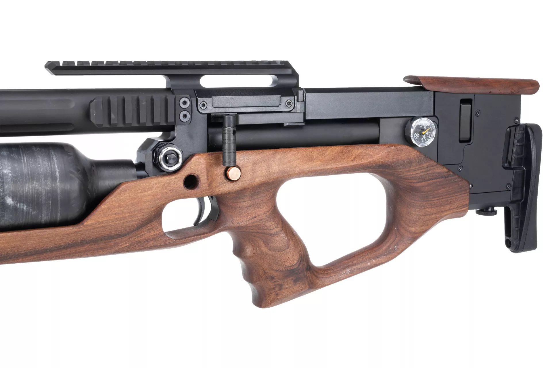 Regulowana wysokość baki policzkowej oraz regulowana wysokość i długość stopki są już standardem w wiatrówkach serii Krait i nie inaczej jest w tej ekskluzywnej wersji.