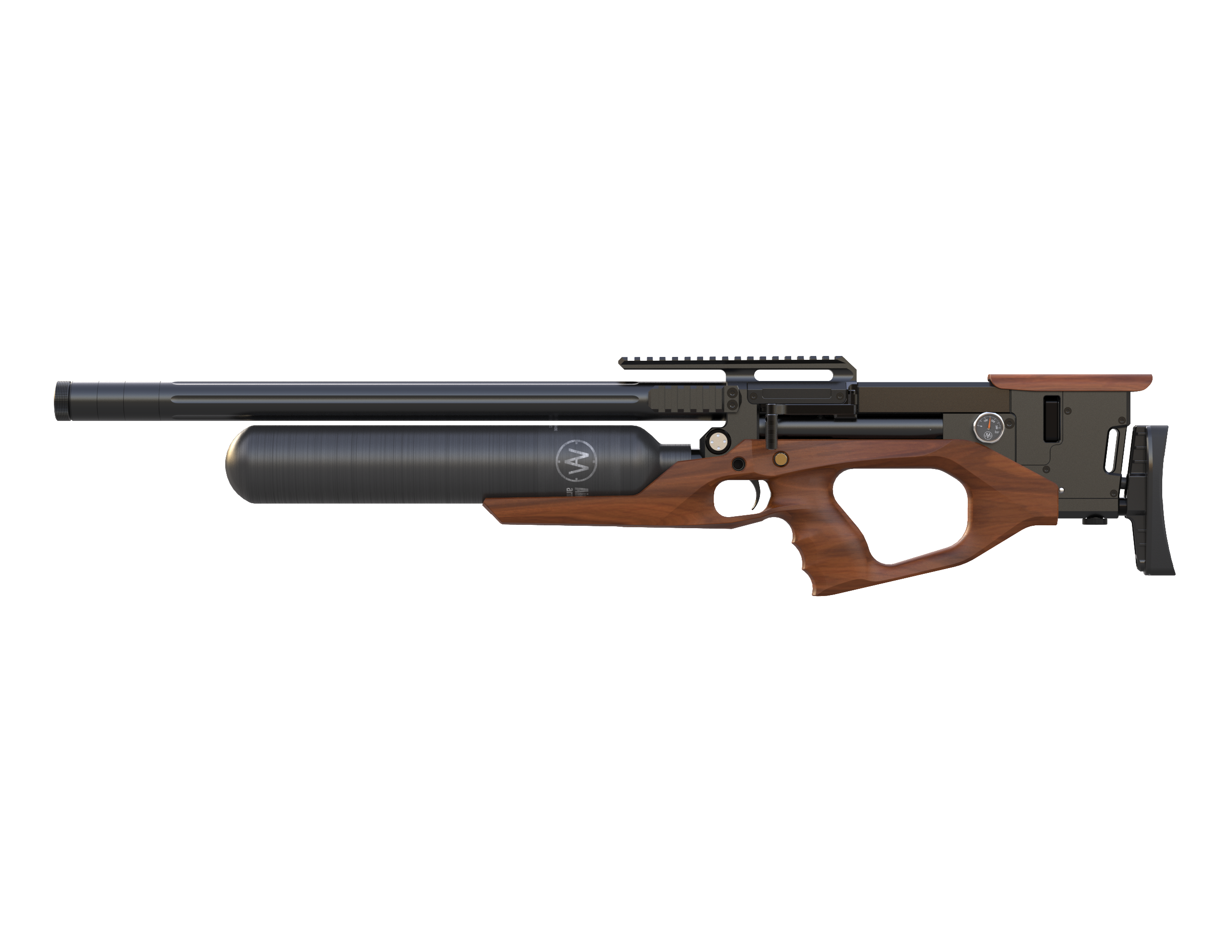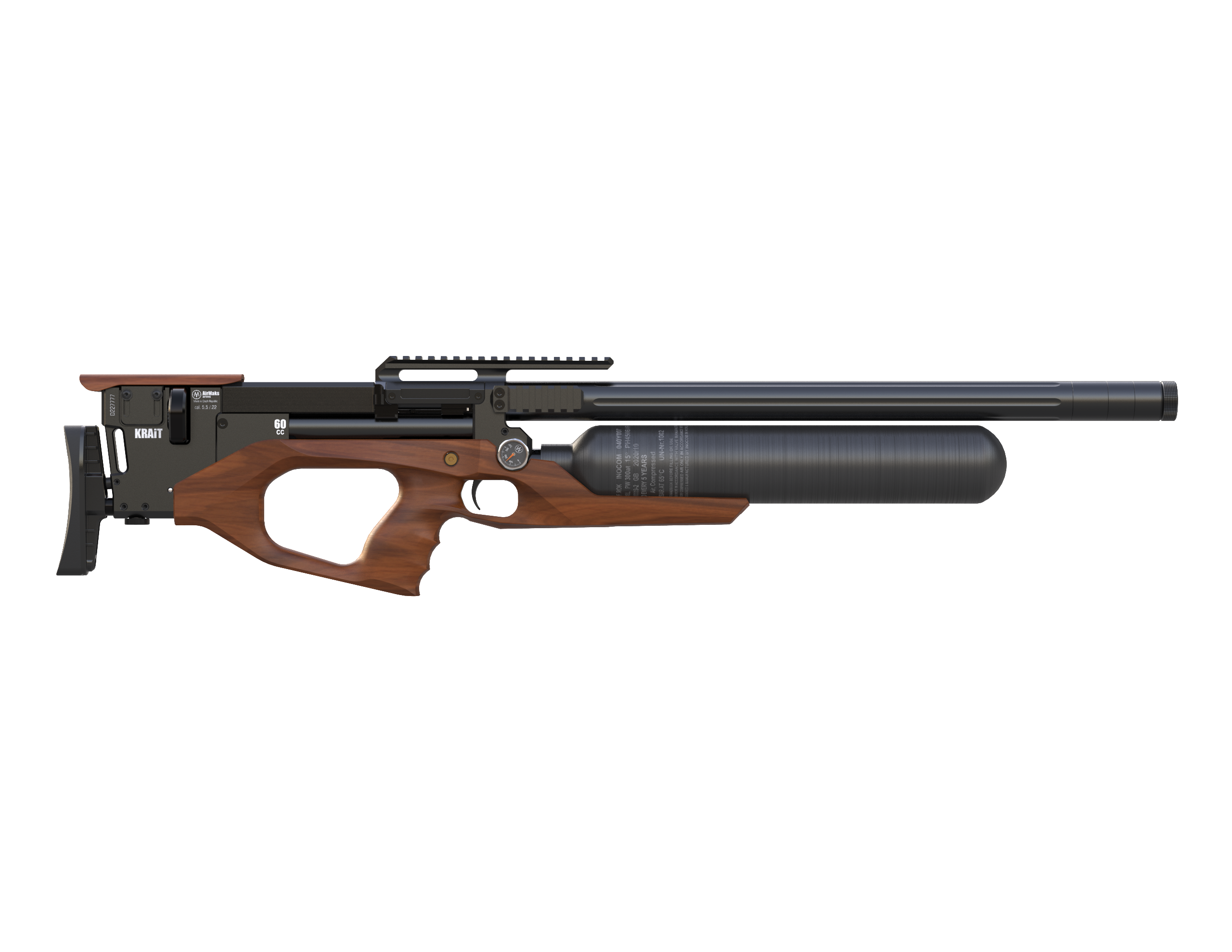 Tym razem kolejnym nabytkiem w rodzinie kompaktowych bullpupów jest model o nazwie Krait WX 6,35 mm. Ta unikalna wersja odróżnia się już na pierwszy rzut oka swoją stylową drewnianą kolbą o ładnych liniach. Również kartusz przeszedł modyfikację - jego pojemność została ponownie zwiększona, teraz do zawrotnych 700 cc. Ostatnią zmianą jest bezpiecznik. Nie jest już zaprojektowany jako pokrętło, ale jako mosiężna wtyczka, którą należy wcisnąć z lewej lub prawej strony.