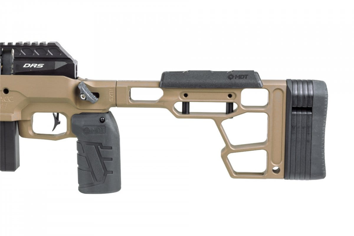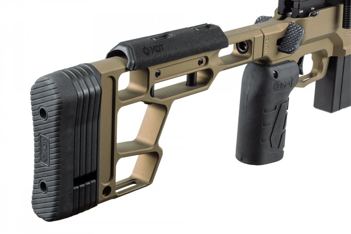 Rozbudowany chwyt MDT Vertical Grip Elite oferuje możliwość pochylenia w celu dostosowania do proporcji każdego strzelca, z kolei nad chwytem po obu stronach znajdują się regulowane metalowe Thumb Resty. Kolba sportowa MDT została zaprojektowana tak, aby zapewnić maksymalną stabilność poprzez zniwelowanie wszelkich wstrząsów podczas strzelania, w czym pomagają mosiężne wstawki - służące do redukcji luzów. Jak mówi sam producent, żadna kolba nie jest w 100% identyczna, nawet jeśli jest produkowana CNC.