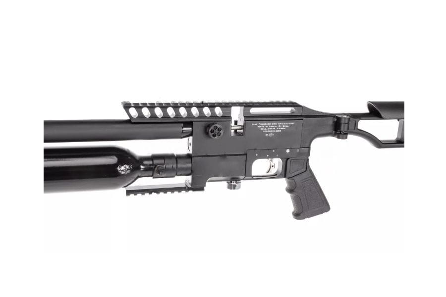 Kartusz powietrza o pojemności 500 cc pomieści maksymalne ciśnienie napełnienia wynoszące 250 Bar. Model ten wyposażony jest w regulator ciśnienia z własnym manometrem umieszczonym w dolnej części korpusu oraz dodatkowy manometr po lewej stronie pistoletu, który pozwala na sprawdzenie aktualnego ciśnienia w kartuszu.