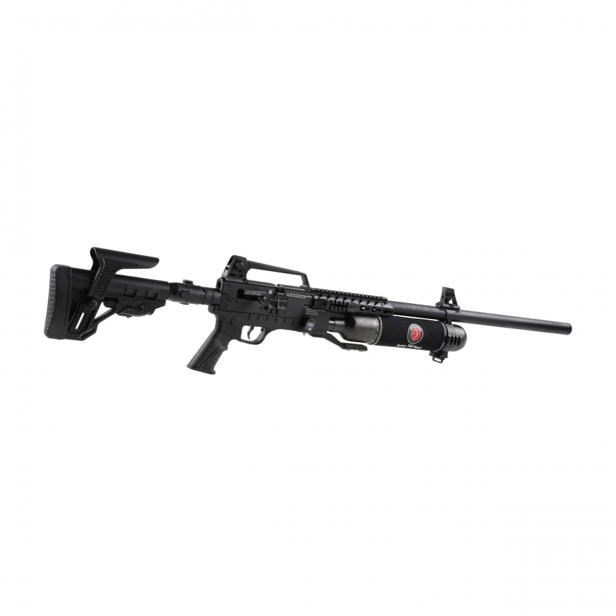 Dokręcany zbiornik o maksymalnym ciśnieniu 300 barów umożliwia kontrolowanie poziomu sprężonego powietrza za pomocą manometru, a regulator stabilizuje energię wylotową, zwiększając precyzję każdego oddanego strzału. W celu zmniejszenia wagi został wykonany z karbonu.