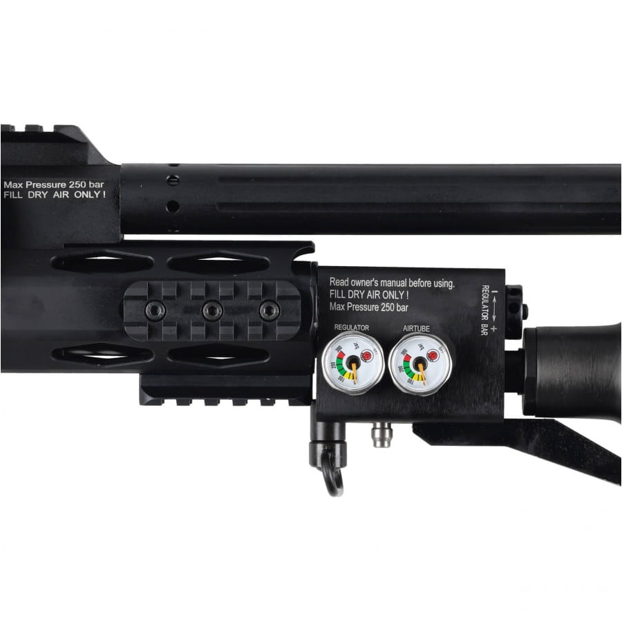 Wyposażona w aluminiową, składaną kolbę, dwa wymienne chwyty (drewniany i syntetyczny), kartusz z włókna węglowego o pojemności aż 580 cc i wbudowany regulator ciśnienia oferuje wszystko, czego potrzebujesz, by strzelać szybko, pewnie i skutecznie. Zadbano również o tłumik dźwięku, zintegrowany monopod, szyny montażowe, a także regulowaną bakę policzkową i stopkę, które umożliwiają idealne dopasowanie do sylwetki i stylu strzelania użytkownika.