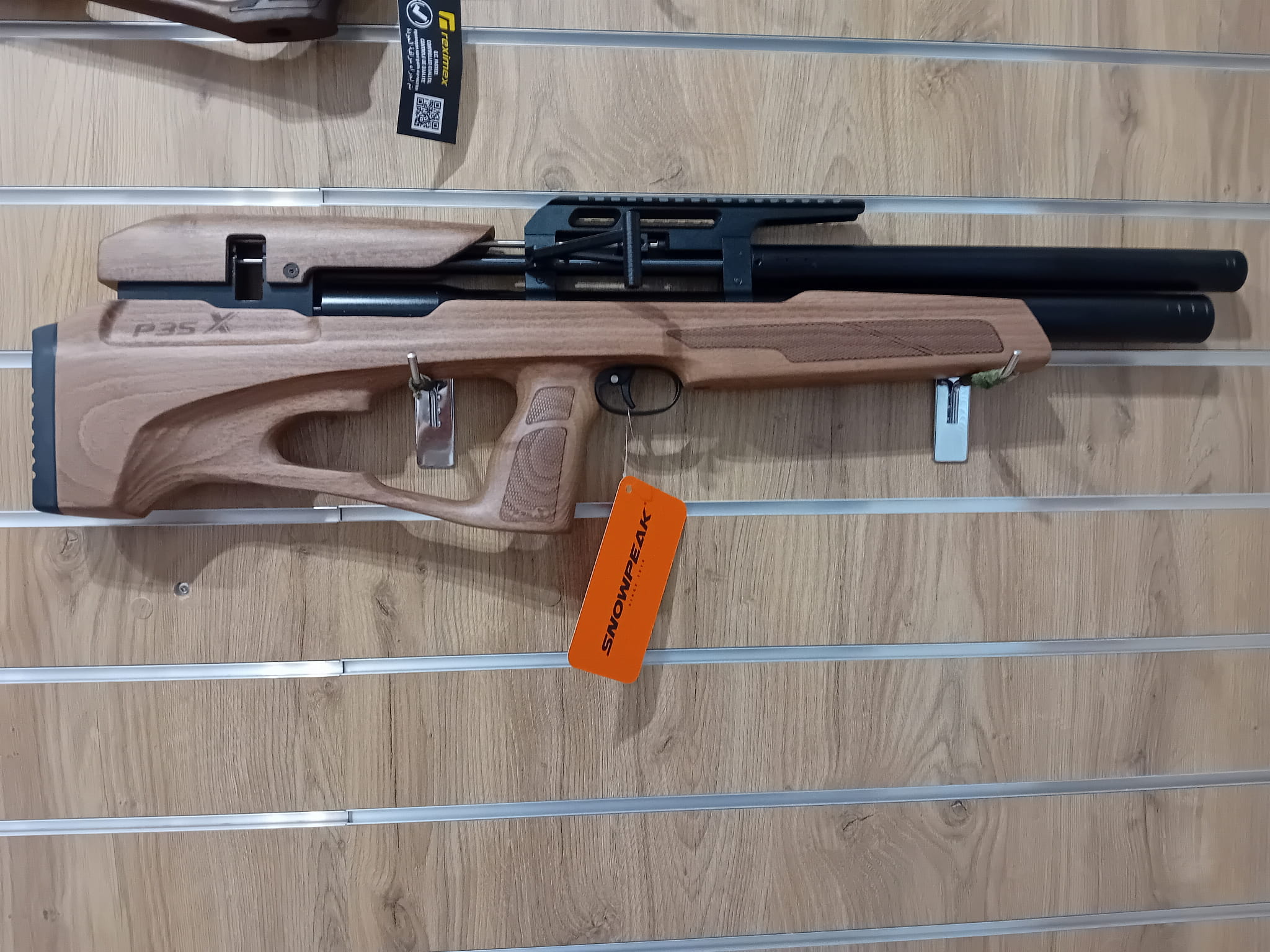Bullpup Snowpeaka korzysta z magazynu. Istnieją różne magazynki, do których można ładować różne kalibry. Każdy kaliber ma swoją własną pojemność magazynka, jak wskazano poniżej: • 4,5 mm / .177 ma pojemność 11x • 5,5 mm / .22 ma pojemność 9x • 6,35 mm / .25 ma pojemność 8x To bullpup, co oznacza, że magazynek mieści się z tyłu P35X, tuż pod podparciem policzka.