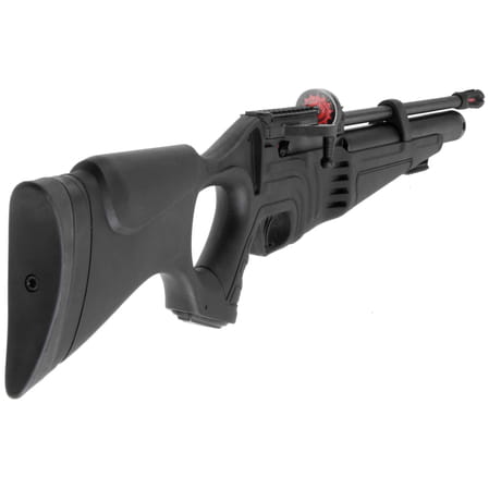 Zasilanie - stały zasobnik sprężonego powietrza o pojemności 215 cc. W pełni naładowany kartusz pozwala na oddanie od 47 do 55 efektywnych strzałów w zależności od kalibru wiatrówki (dane dla wersji FAC*). Wbudowany manometr pozwala na bieżąco kontrolować ciśnienie znajdujące się w zbiorniku, a tym samym stopnień jego naładowania. 100 bar minimalne ciśnienie robocze w kartuszu, zalecane przez producenta.
