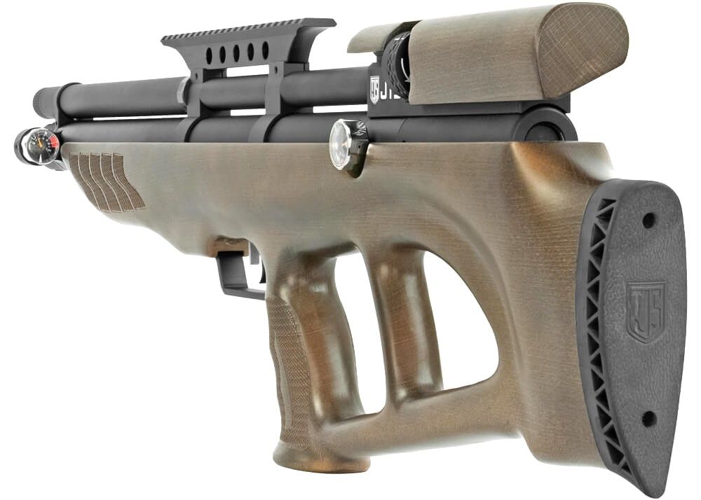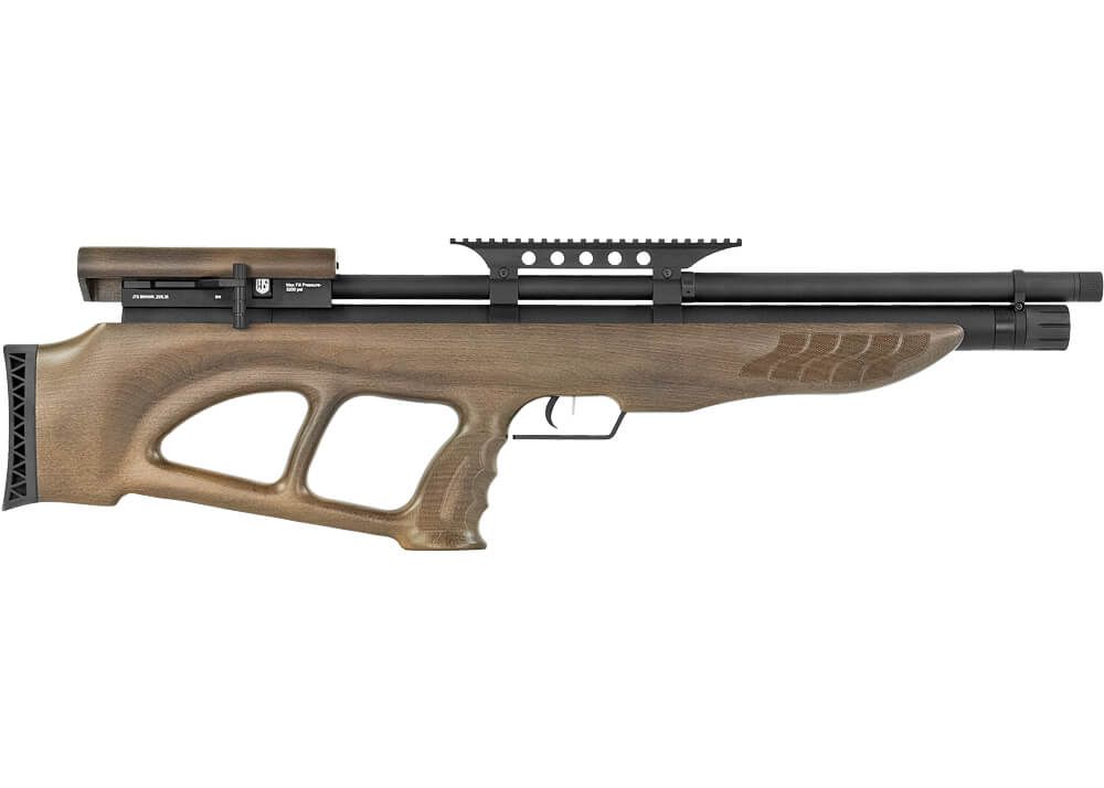 Ten karabin JTS Brawn Bullpup PCP jest wykonany w całości z metalu i ma pięknie wykończony bulion z drewna. Posiada lufę o długości 437 mm i ma łączną długość 838 mm. Brawn ma solidną konstrukcję i waży około 4220 gramów, co można przypisać pełnej konstrukcji metalowej i drewnianej. A jednak karabin pneumatyczny jest świetny do trzymania w rękach. Drewniany zapas posiada ergonomiczny uchwyt w stylu pistoletu z wstępnie uformowanymi rowkami palców i chropowatą, laserową teksturą po obu stronach. Ta tekstura jest również laserowana w boki przedniej części i zapewnia nieco większy chwyt. Zapas ma dziurę kciuka, która pozwala na wygodne strzelanie, a odpoczynek policzków z drewna jest również bardzo wygodny. Gumowa płyta z tyłu JTS Brawn zapewnia większą stabilność, co znacznie poprawia dokładność.