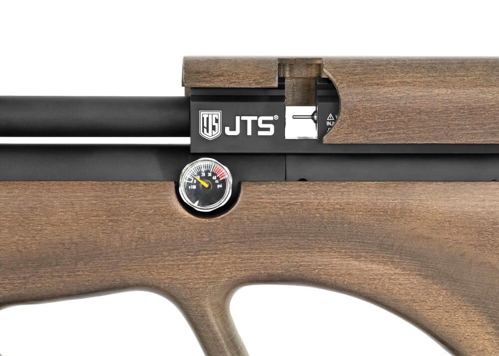 JTS Brawn używa cylindra PCP z ciśnieniem napełniania 220 bar / 3200 PSI, aby strzelać z tych granulek, a cylinder znajduje się tuż pod osłoną lufy. Całun lufy i cylinder są połączone z opaską lufy w kierunku przodu całunu lufy, czyli również tam, gdzie znajdziesz manometr. Ten manometr można odwrócić od lewej do prawej, więc strzelec zawsze może mieć na to oko. Regulowany system zapewnia stałą moc strzału, o ile ciśnienie jest odpowiednie. Z boku karabinu znajduje się manometr, który można wykorzystać do sprawdzenia ciśnienia napełniania regulatora.