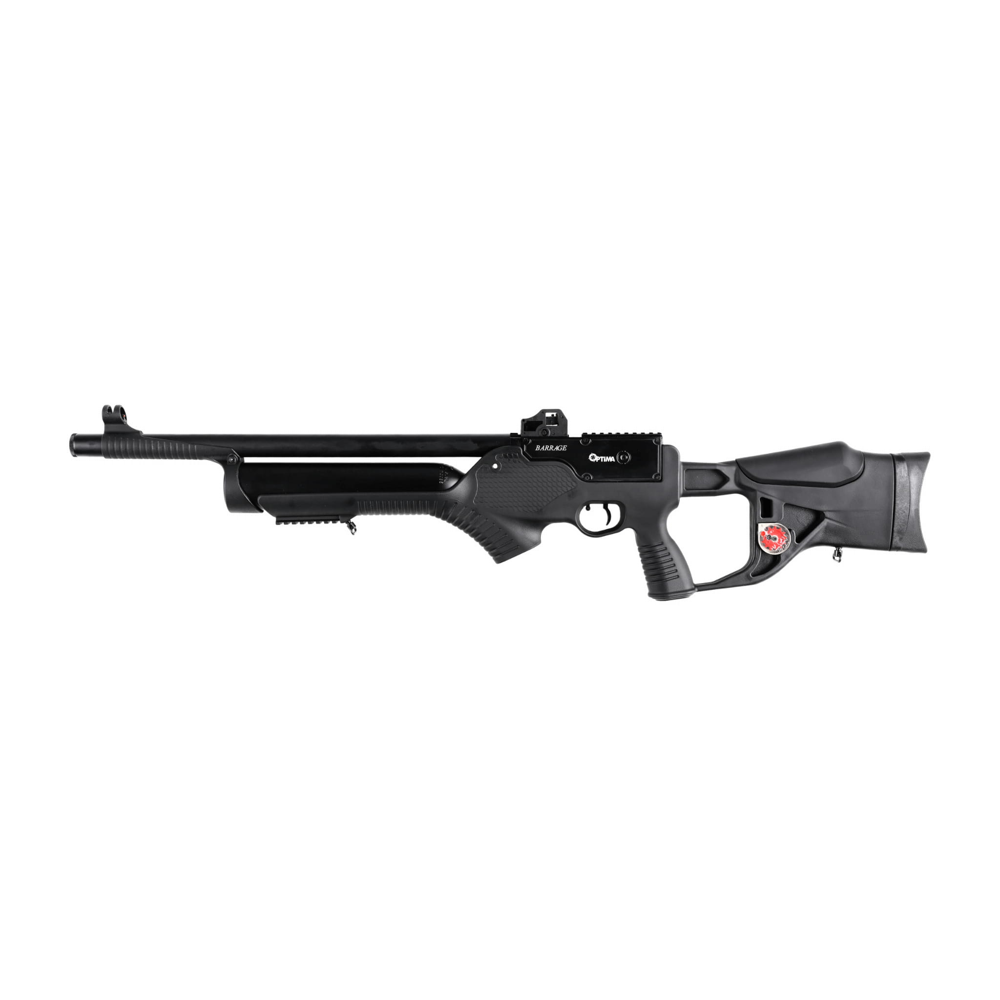Karabinek ma precyzyjnie bruzdowaną lufę o długości aż 500 mm zakończoną czokiem (zwężeniem), który w przypadku długiej lufy zapewnia lepsze prowadzenie i uszczelnienie śrutu w przewodzie lufy. Pływającą lufę zabezpiecza przed uszkodzeniem aluminiowy rękaw wykończony metodą anodowania. Proces ten chroni aluminium przed utlenianiem i utwardza jego powierzchnie. Do zasilania Optima by Hatsan Barrage zastosowano stały kartusz na sprężone powietrze o pojemności 500 cc. Naładowany do pełna zasobnik hp pozwala na oddanie około 120 strzałów. Dzięki wbudowanemu manometrowi użytkownik może w łatwy sposób kontrolować ciśnienie i pozostały zapas powietrza.
