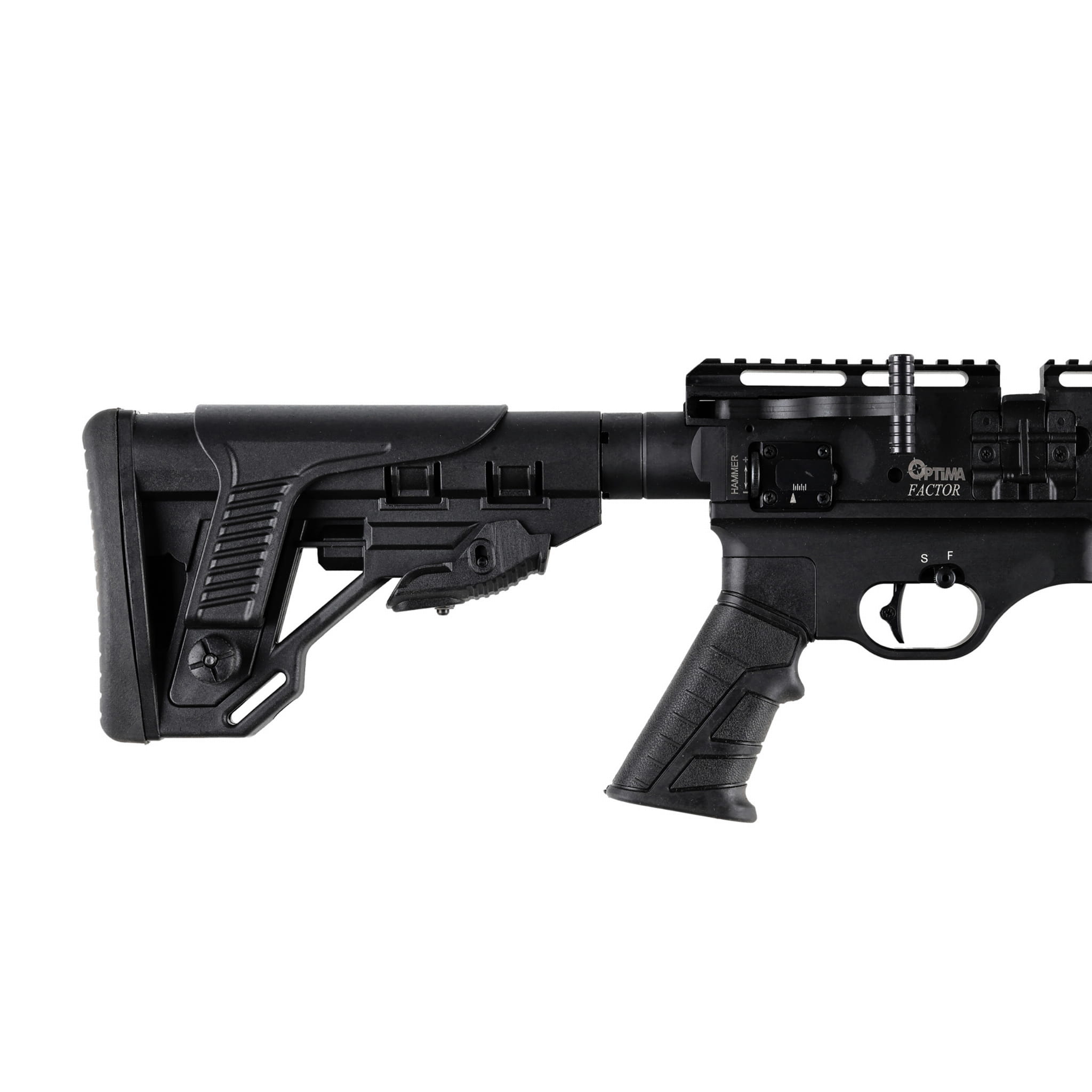 Optima by Hatsan Factor ma lekki aluminiowy korpus oraz szereg rozwiązań konstrukcyjnych zapożyczonych z amerykańskiego karabinka szturmowego AR15 m.in. profilowany chwyt pistoletowy, teleskopową kolbę z regulowaną baką policzkową oraz grzbietową szynę 11/22 mm do montaży optyki. Rozsuwaną kolbę można błyskawicznie dostosować do budowy i preferencji strzelca dzięki, a dzięki regulowanej bace policzkowej jesteśmy w stanie idealnie dopasować nasze złożenie do strzału. Krótka szyna na dole osady idealnie sprawdzi się jako do montażu bipodu, który zwiększa precyzję strzelania na dużym dystansie.