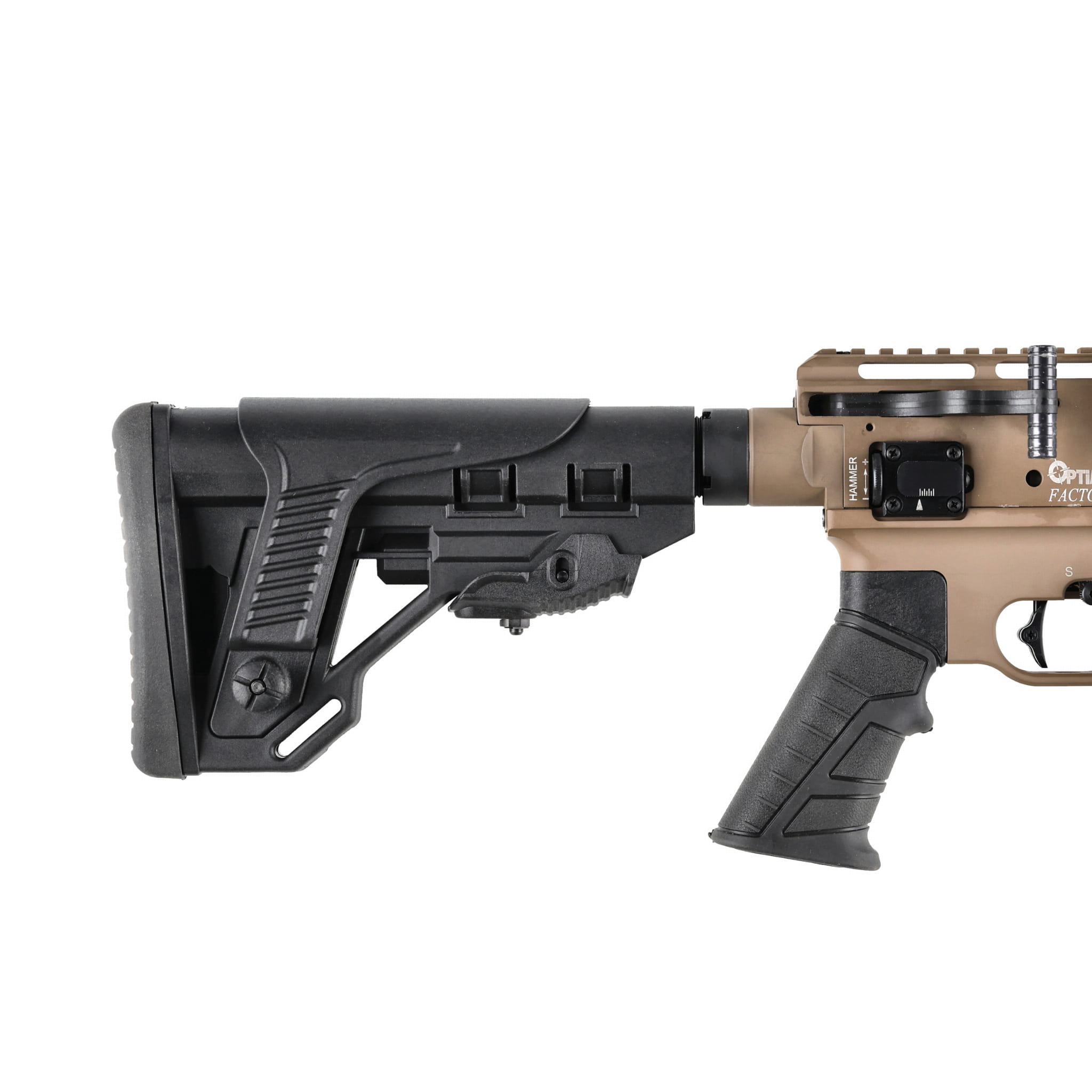 Optima by Hatsan Factor ma lekki aluminiowy korpus oraz szereg rozwiązań konstrukcyjnych zapożyczonych z amerykańskiego karabinka szturmowego AR15 m.in. profilowany chwyt pistoletowy, teleskopową kolbę z regulowaną baką policzkową oraz grzbietową szynę 11/22 mm do montaży optyki. Rozsuwaną kolbę można błyskawicznie dostosować do budowy i preferencji strzelca dzięki, a dzięki regulowanej bace policzkowej jesteśmy w stanie idealnie dopasować nasze złożenie do strzału. Krótka szyna na dole osady idealnie sprawdzi się jako do montażu bipodu, który zwiększa precyzję strzelania na dużym dystansie.