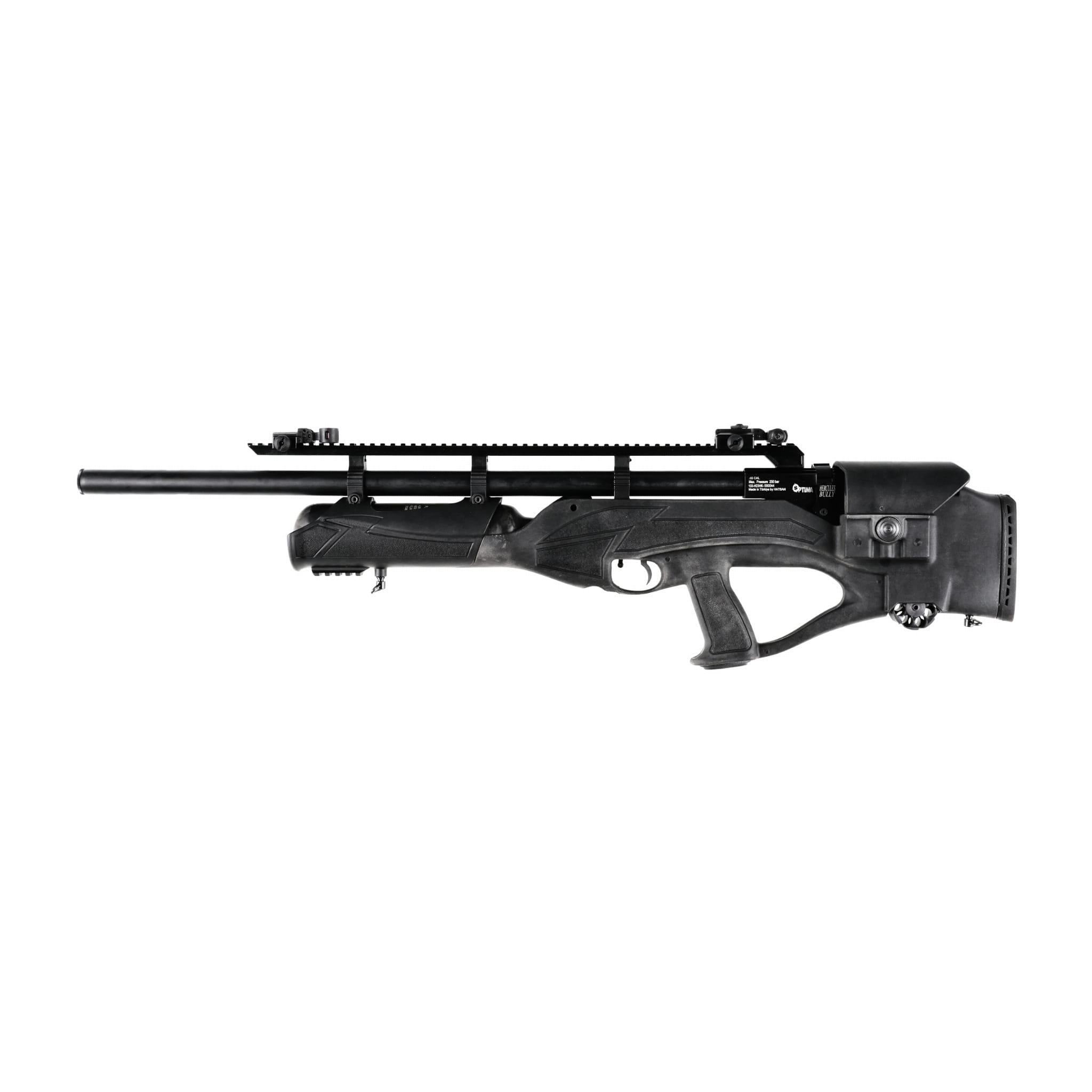 Wiatrówka PCP Optima by Hatsan Bully 11,43 mm to karabinek pcp w układzie bullpup, wyposażony w precyzyjną czokowaną lufę ze zintegrowanym moderatorem dźwięku, ergonomiczną kolbę thumbhole oraz regulowany 2-stopniowy mechanizm spustowy.