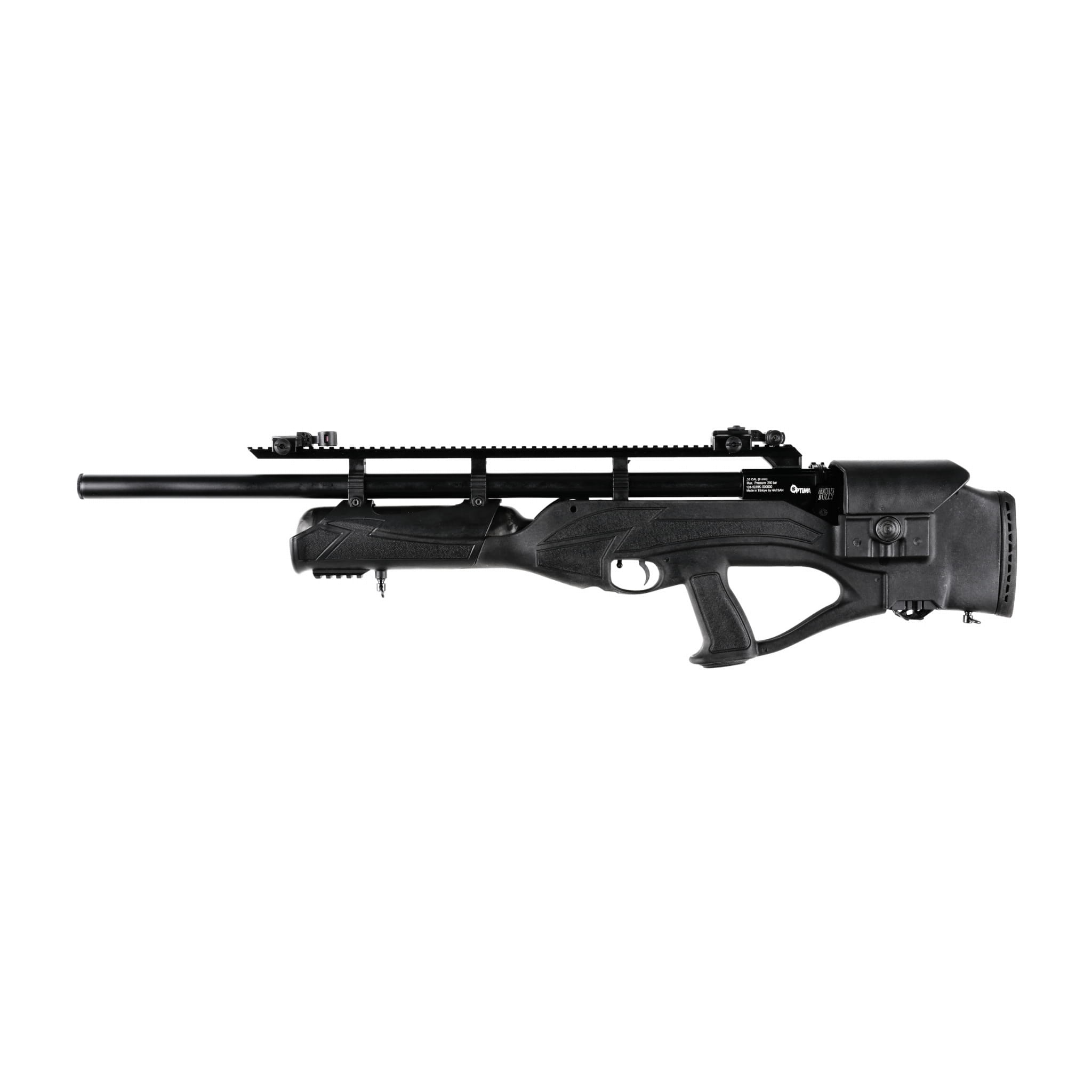 Wiatrówka PCP Optima by Hatsan Bully 9 mm to karabinek pcp w układzie bullpup, wyposażony w precyzyjną czokowaną lufę ze zintegrowanym moderatorem dźwięku, ergonomiczną kolbę thumbhole oraz regulowany 2-stopniowy mechanizm spustowy.