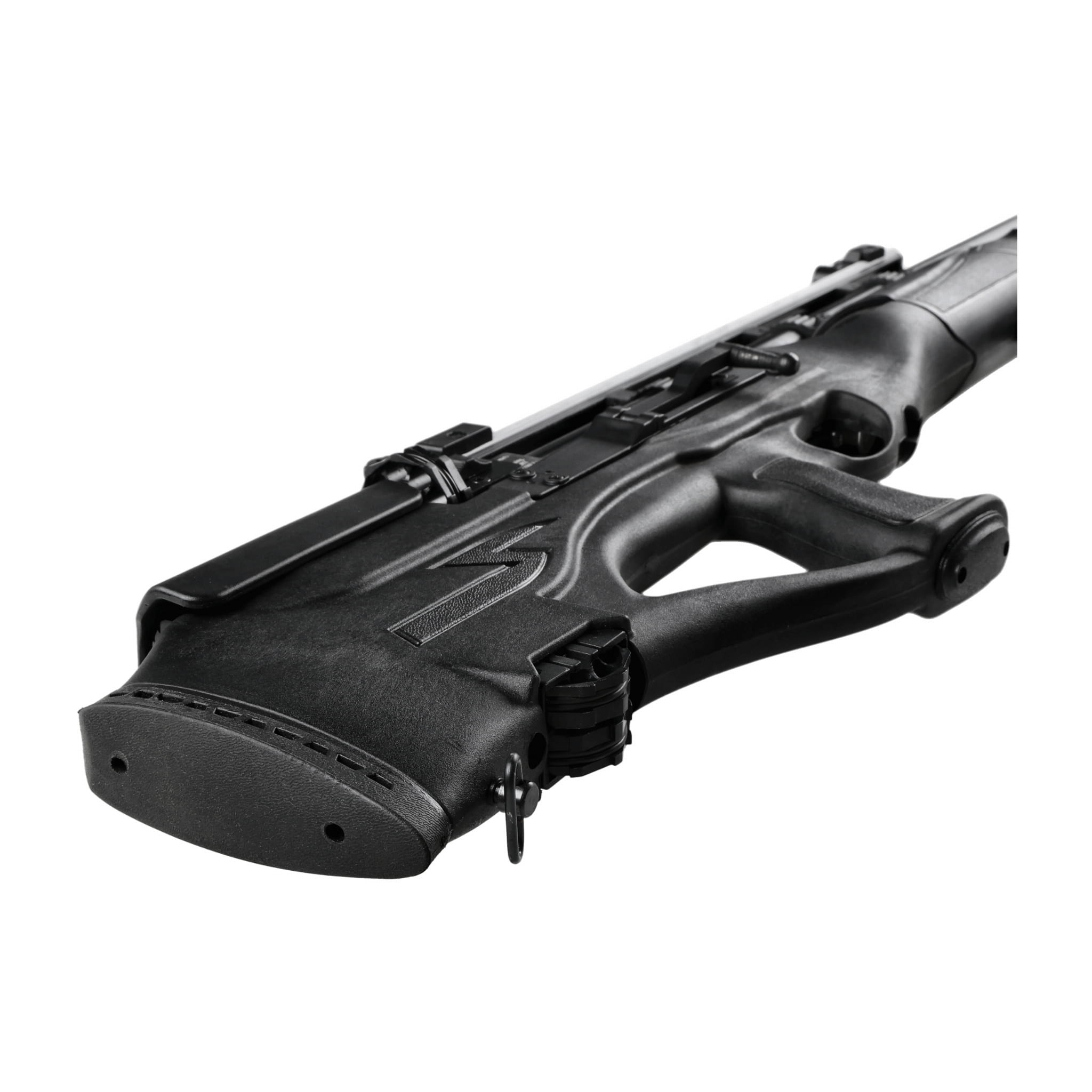 W karabinku Optima by Hatsan Hercules Bully 9 mm zastosowano futurystyczną osadę wykonaną z polimeru odpornego na uszkodzenia mechaniczne polimeru oraz warunki atmosferyczne. Dzięki bezkolbowej konstrukcji wiatrówka bullpup jest krótsza i bardziej składna, zachowując jednocześnie długą lufę i optymalną linię celowania. Ergonomiczne łoże ma wydzielony chwyt pistoletowy, symetryczną kolbę z przestrzenią na kciuk (thumb-hole) oraz 2 gniazda do przenoszenia zapasowych magazynków. Chwyt pistoletowy oraz przednia część łoża mają antypoślizgowe ryflowanie, które pomaga w zachowaniu pełnej kontroli nad karabinkiem. Karabinek Optima by Hatsan Hercules Bully ma podwójną szyną 11/22 mm na celownik optyczny oraz dodatkową szynę Picatinny pozwalającą na zastosowanie bipodu. W zestawie otrzymujemy składane przyrządy celownicze Tru-glo, które dzięki składanej konstrukcji mogą pełnić funkcję zapasowego celownika. Kolbę można dostosować do budowy i preferencji strzelca dzięki zastosowaniu regulowanej baki policzkowej, której wysokość można błyskawicznie dostosować za pomocą przycisku.