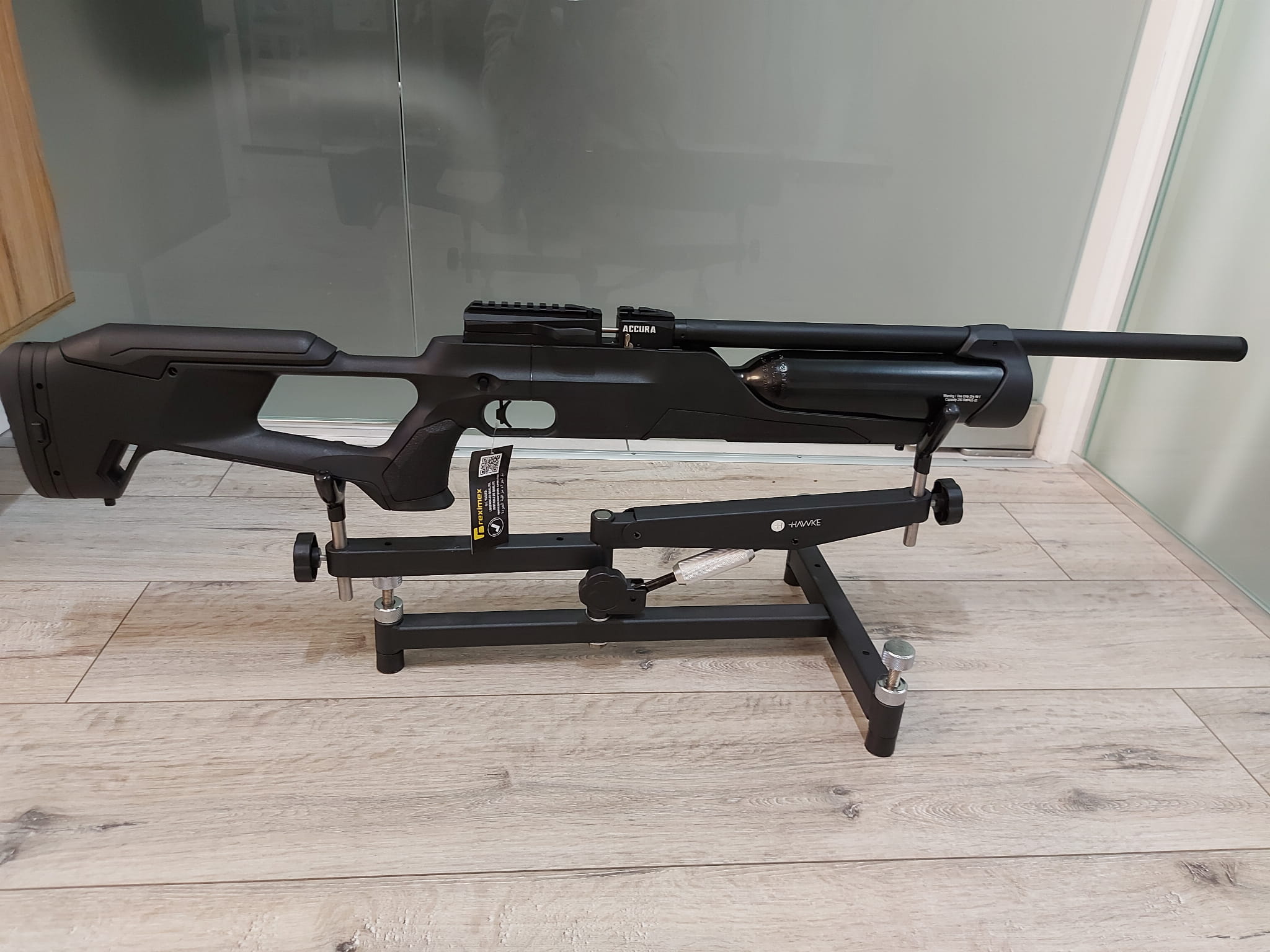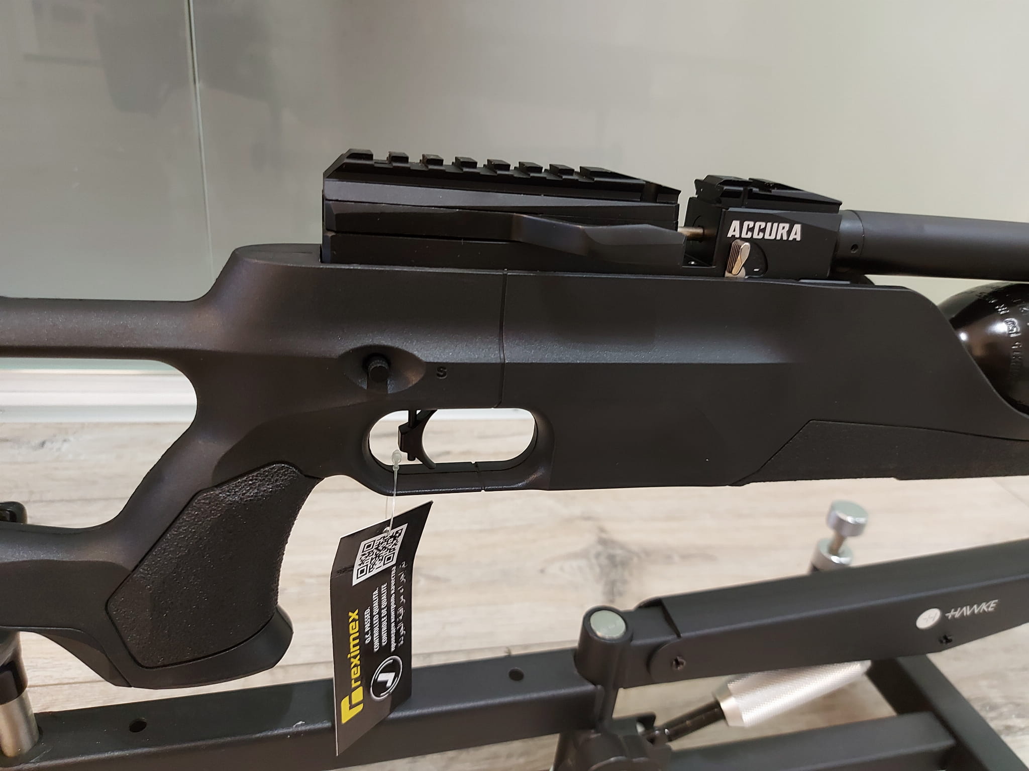 Reximex Accura to nowoczesny, wielostrzałowy karabin PCP o regulowanej mocy strzału. Wyposażony w tłumik, regulowaną stopkę oraz bakę policzkową, regulowany język spustowy oraz pojemny kartusz 425 ml. Osada z otworem na kciuk TH (ThumbHole) wykonana jest z wytrzymałego polimeru. Wiatrówka dostępna w kalibrach 4,5 mm, 5,5 mm oraz 6,35 mm.