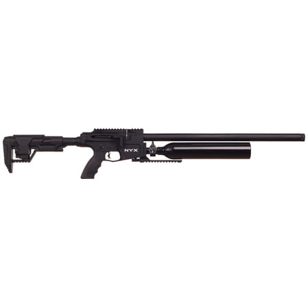 Reximex NYX, nowoczesna wiatrówka PCP w praktycznej osadzie taktycznej z chwytem pistoletowym. Dzięki teleskopowej kolbie w systemie AR oraz regulowanej bace policzkowej można karabin w pełni dostosować do swoich preferencji. Pojemny zbiornik powietrza 500cc zadowoli miłośników długiego strzelania, bez martwienia się o uzupełnianie kartusza. Wiatrówkę wyposażono w precyzyjną gwintowaną lufę ze zintegrowanym tłumikiem, regulator ciśnienia, biathlonową dźwignię przeładowania Side Lever, szynę na optykę 22 mm, matchowy język spustowy o regulowanej twardości. Dostępny w kalibrach: .177 (4.5 mm), .22 (5.5 mm), .25 (6.35 mm).