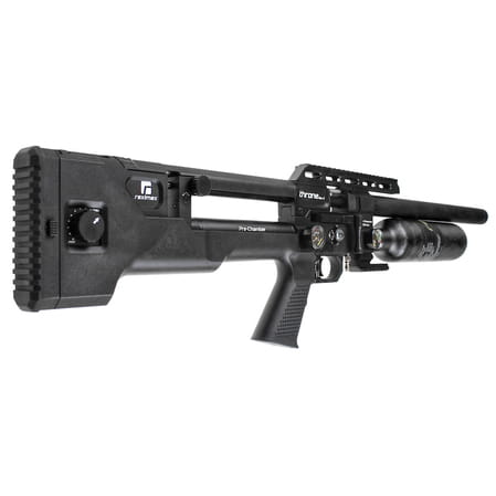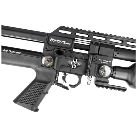 Reximex Throne Gen2 Carbon, nowoczesna wiatrówka PCP w znanej z przesunięcia komory i magazynika za spust wersji Bullpup z lekkim kartuszem z włókna węglowego. Poprzez zastosowanie układu bezkolbowego, uzyskano kompaktowe wymiary karabinu, przy zachowaniu normalnej długości lufy gwarantującej celność i zasięg oraz typową dla tej konstrukcji redukcję wagi dla lepszej kontroli. Throne Gen2 wyposażono w dźwignię napinania Side Lever, regulator mocy strzału, pokrętło regulacji mechanizmu spustowego oraz lufę ze zintegrowanym tłumikiem dźwięku. Dostępny w kalibrach: .177 (4.5 mm), .22 (5.5 mm), .25 (6.35 mm).