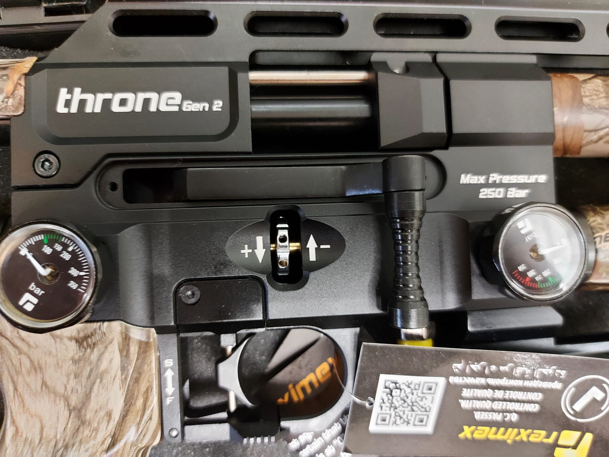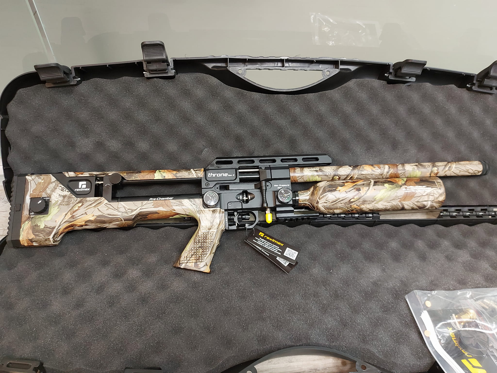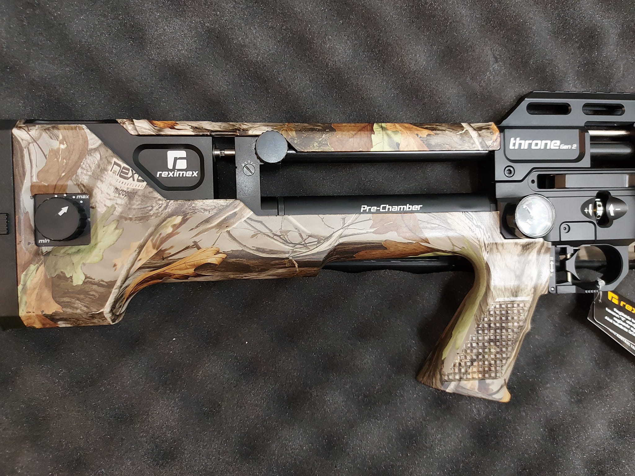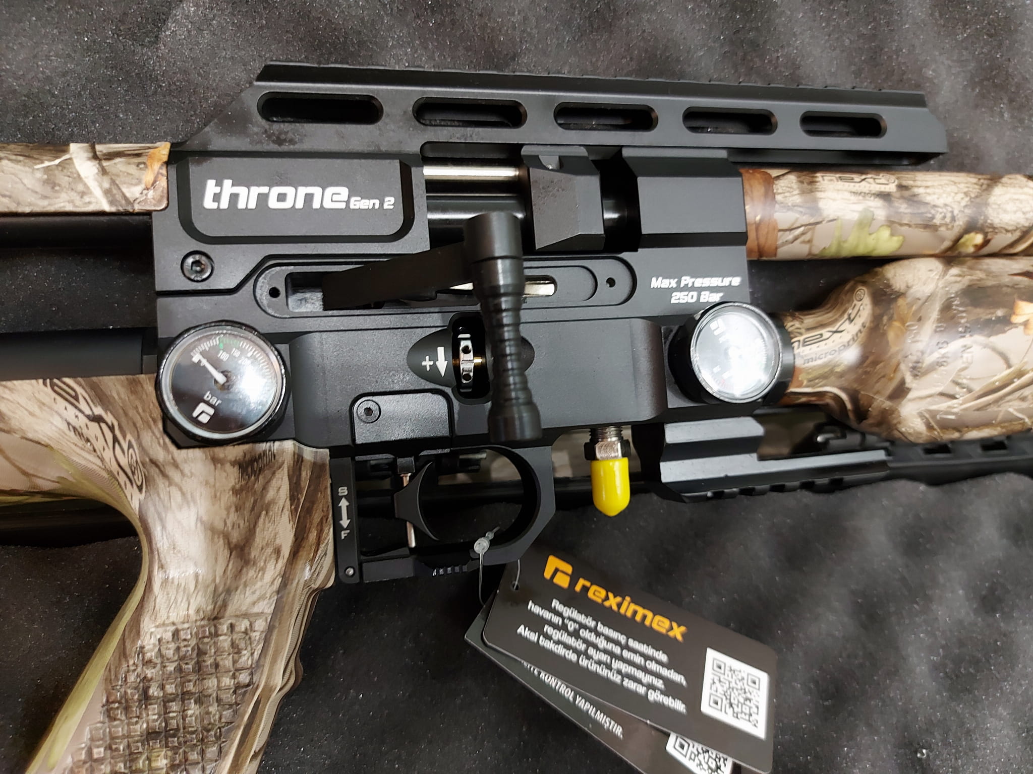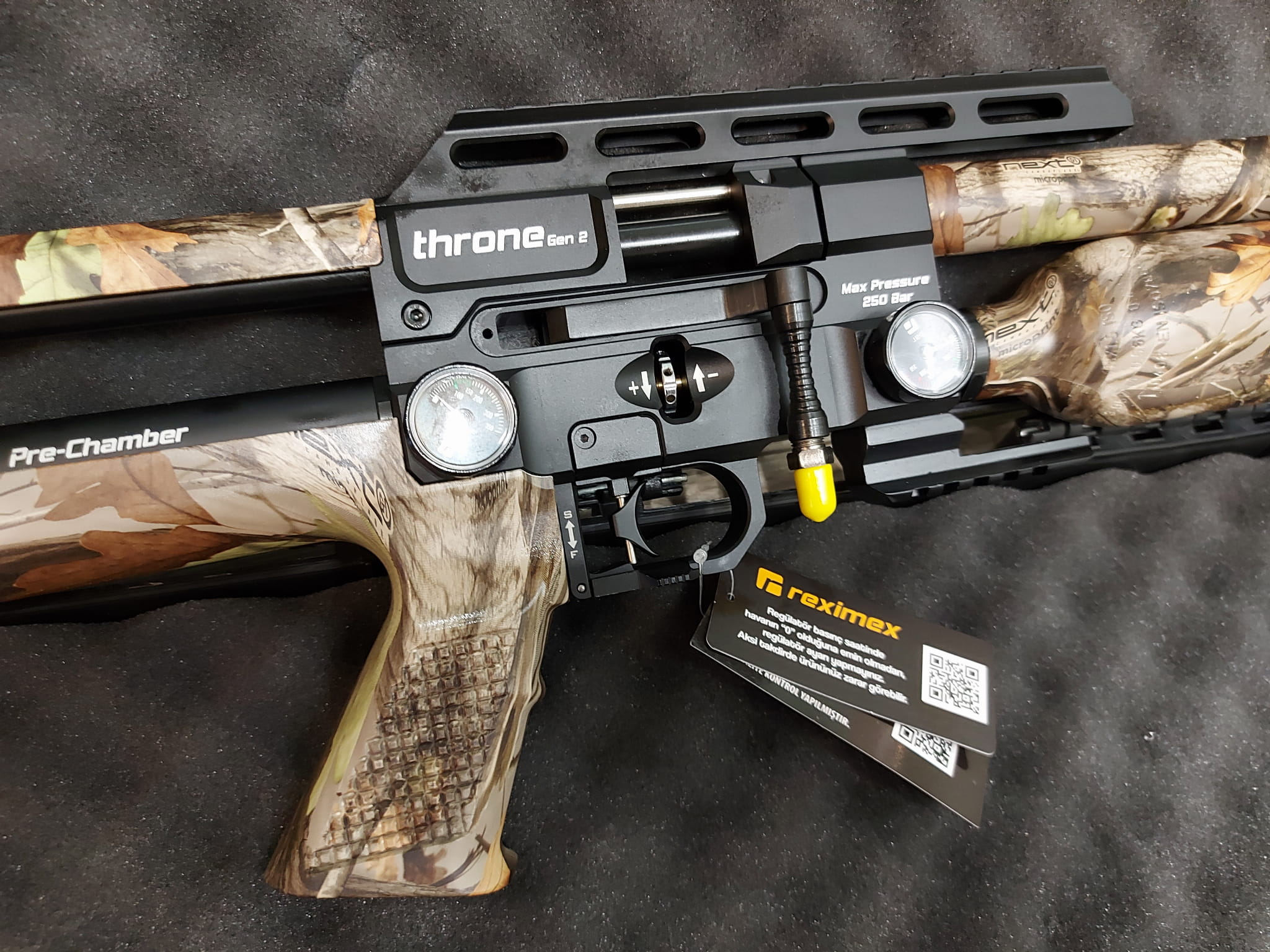 Reximex Throne Gen2 G1 Camo, nowoczesna wiatrówka PCP w znanej z przesunięcia komory i magazynika za spust wersji Bullpup. Poprzez zastosowanie układu bezkolbowego, uzyskano kompaktowe wymiary karabinu, przy zachowaniu normalnej długości lufy gwarantującej celność i zasięg oraz typową dla tej konstrukcji redukcję wagi dla lepszej kontroli. Throne Gen2 wyposażono w dźwignię napinania Side Lever, regulator mocy strzału, pokrętło regulacji mechanizmu spustowego oraz lufę ze zintegrowanym tłumikiem dźwięku. Dostępny w kalibrach: .177 (4.5 mm), .22 (5.5 mm), .25 (6.35 mm).