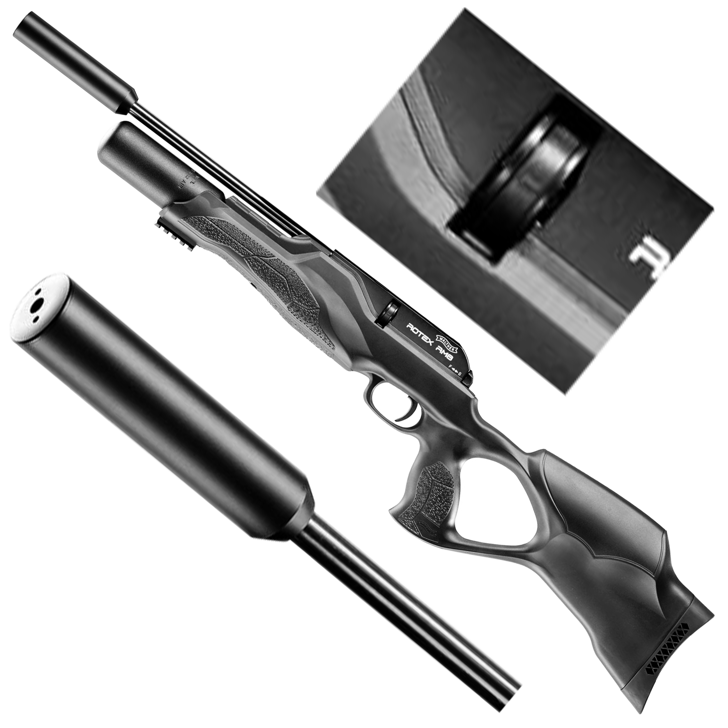 Walther Rotex RM8 Varmint UC 4,5 mm PCP to nowoczesny karabinek PCP, w którym zastosowano polimerową osadę thumbhole, precyzyjną lufę Lothar Walther z gwintem zewnętrznym oraz kartusz o pojemność 200 cm3 zapewniających do 110 strzałów.