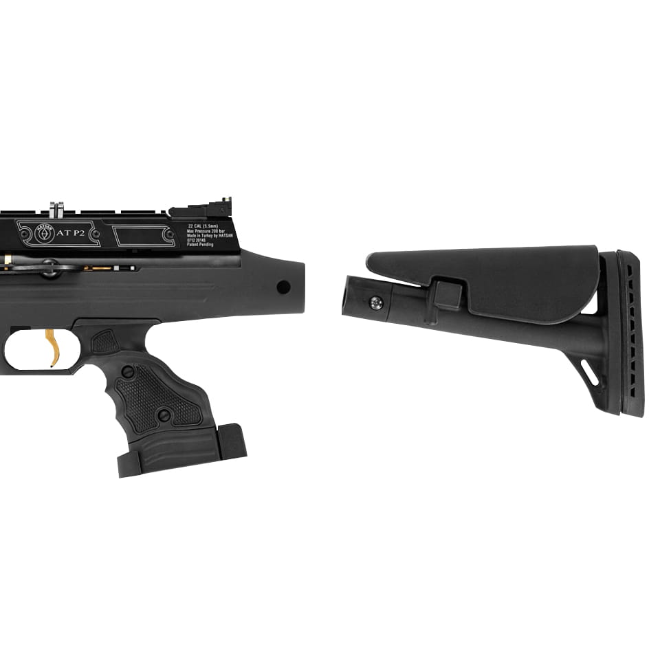 Pistolet PCP Optima by Hatsan AT-P2 QE 4,5 mm to mocny i precyzyjny pistolet pcp, wyposażony w teleskopową kolbę taktyczną, podwójną szynę montażową oraz regulowany 2-stopniowy mechanizm spustowy.
