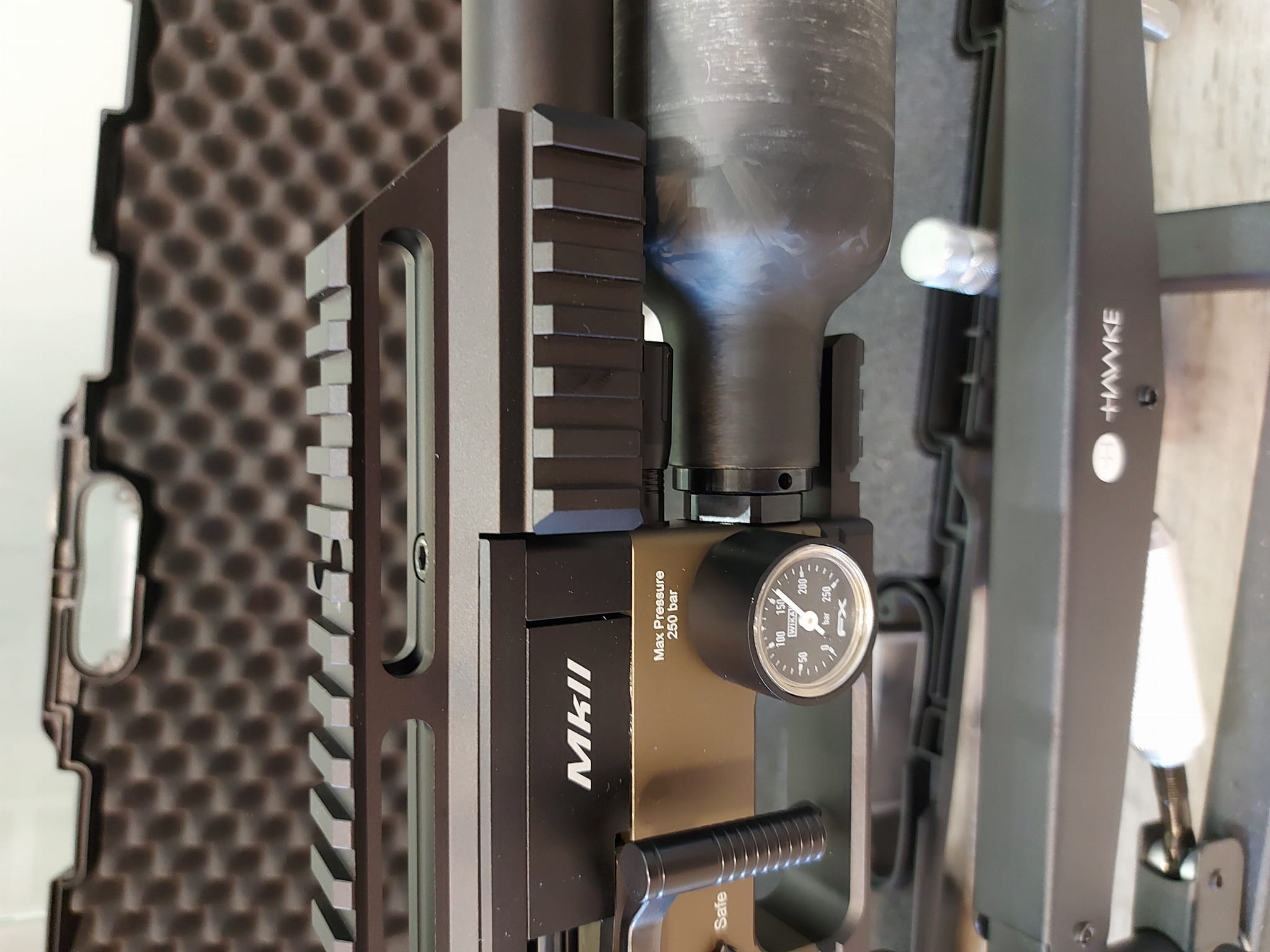 Karbonowy kartusz mieści niewiarygodne 480 cm3 sprężonego powietrza. W zakresie od 250 do 125 bar można oddać 100 równych strzałów. Śruba regulacyjna regulatora znajduje się w obrębie kabłąka.