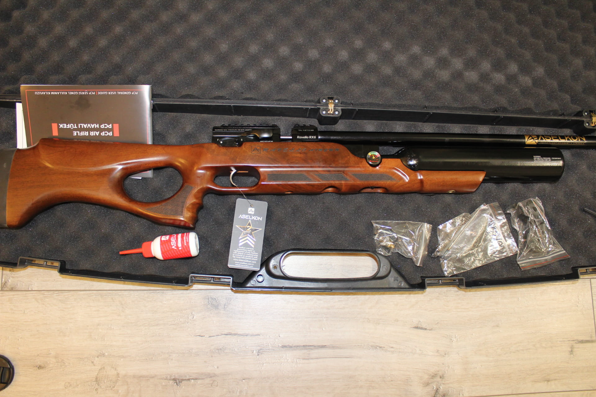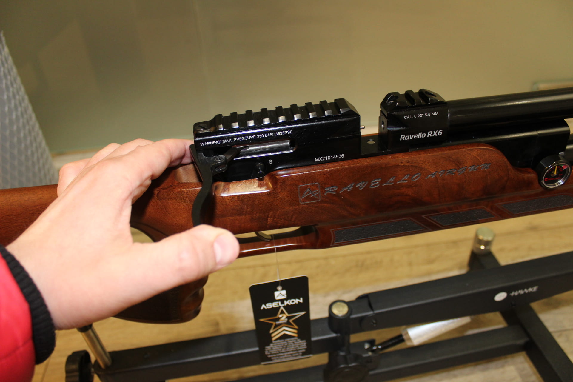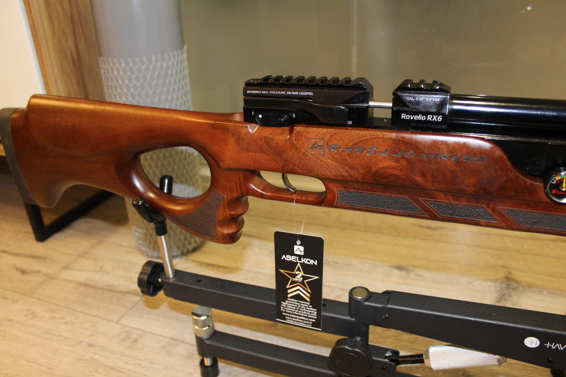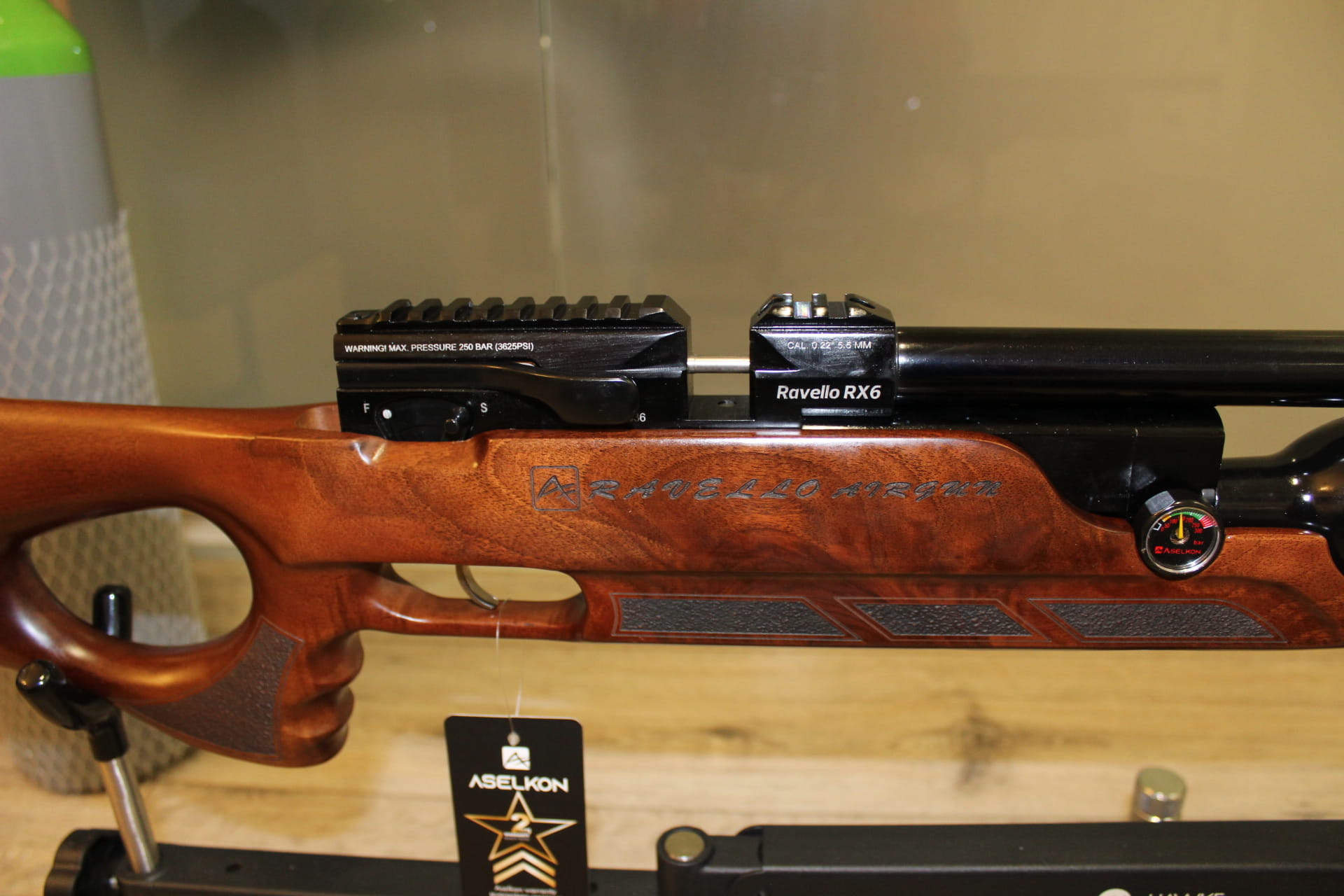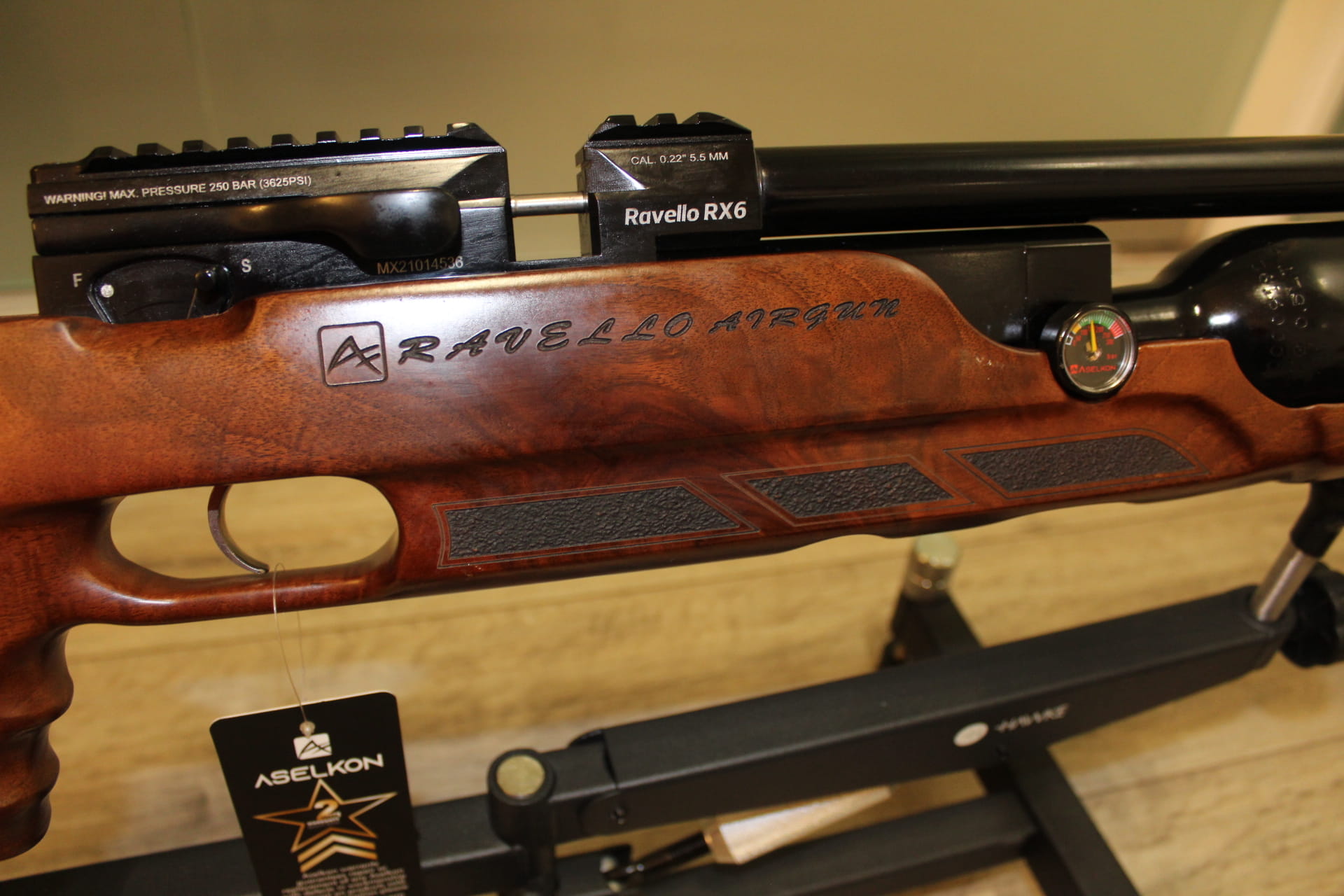 Aselkon Ravello RX 6 posiada 1/2 L butlę, która pozwala na oddanie ok 140 równych strzałów przy energii 17J Osada karabinka została wykonana z drewna orzechowego, wspaniale wykonana z chwytem pistoletowym, który zapewnia stabilność i wygodę podczas strzelania, specjalne bruzdy wyprofilowane na palce.
