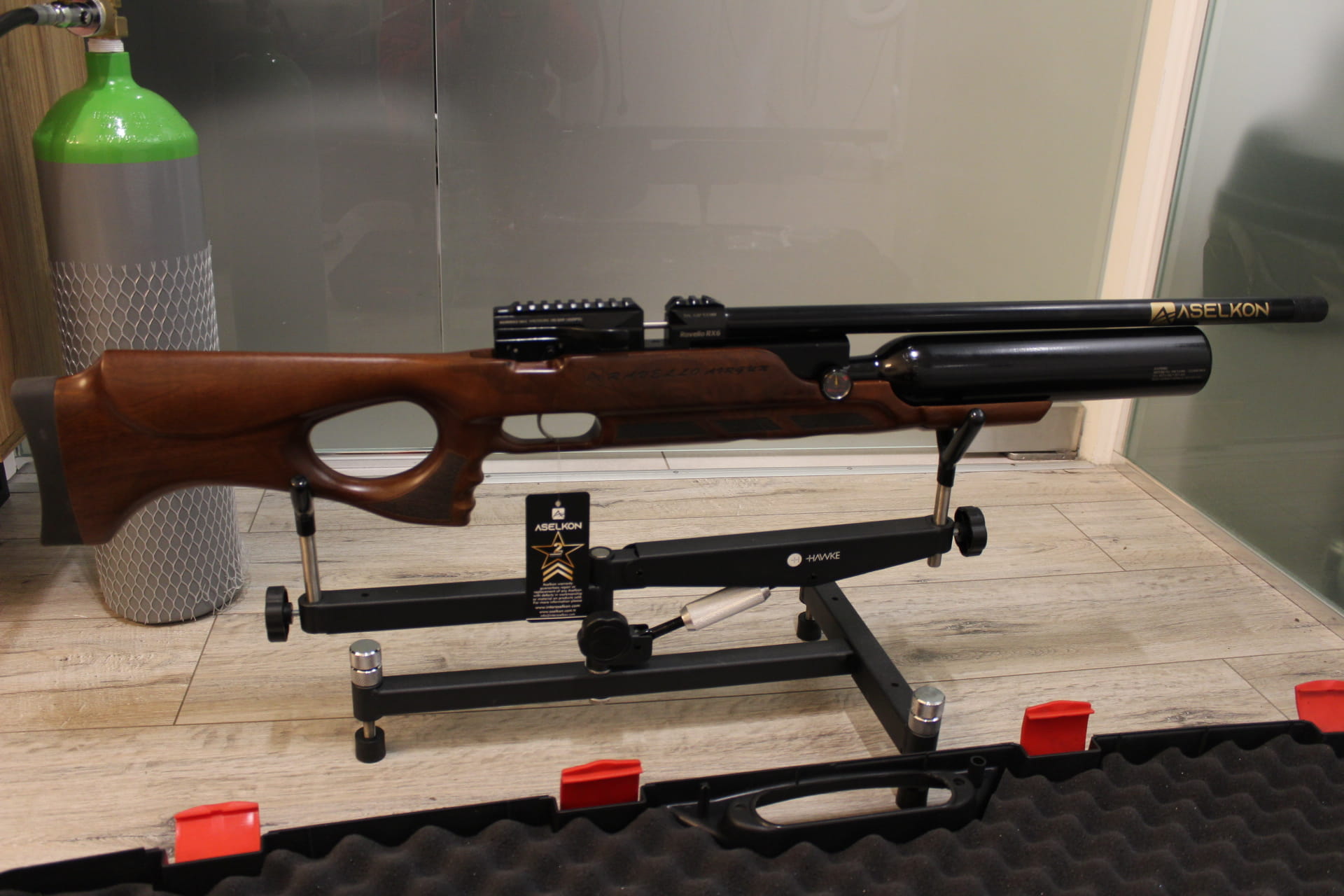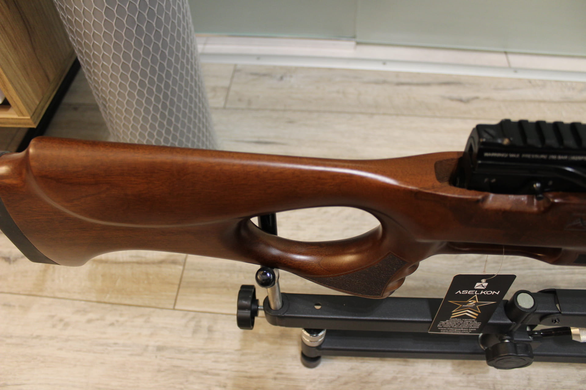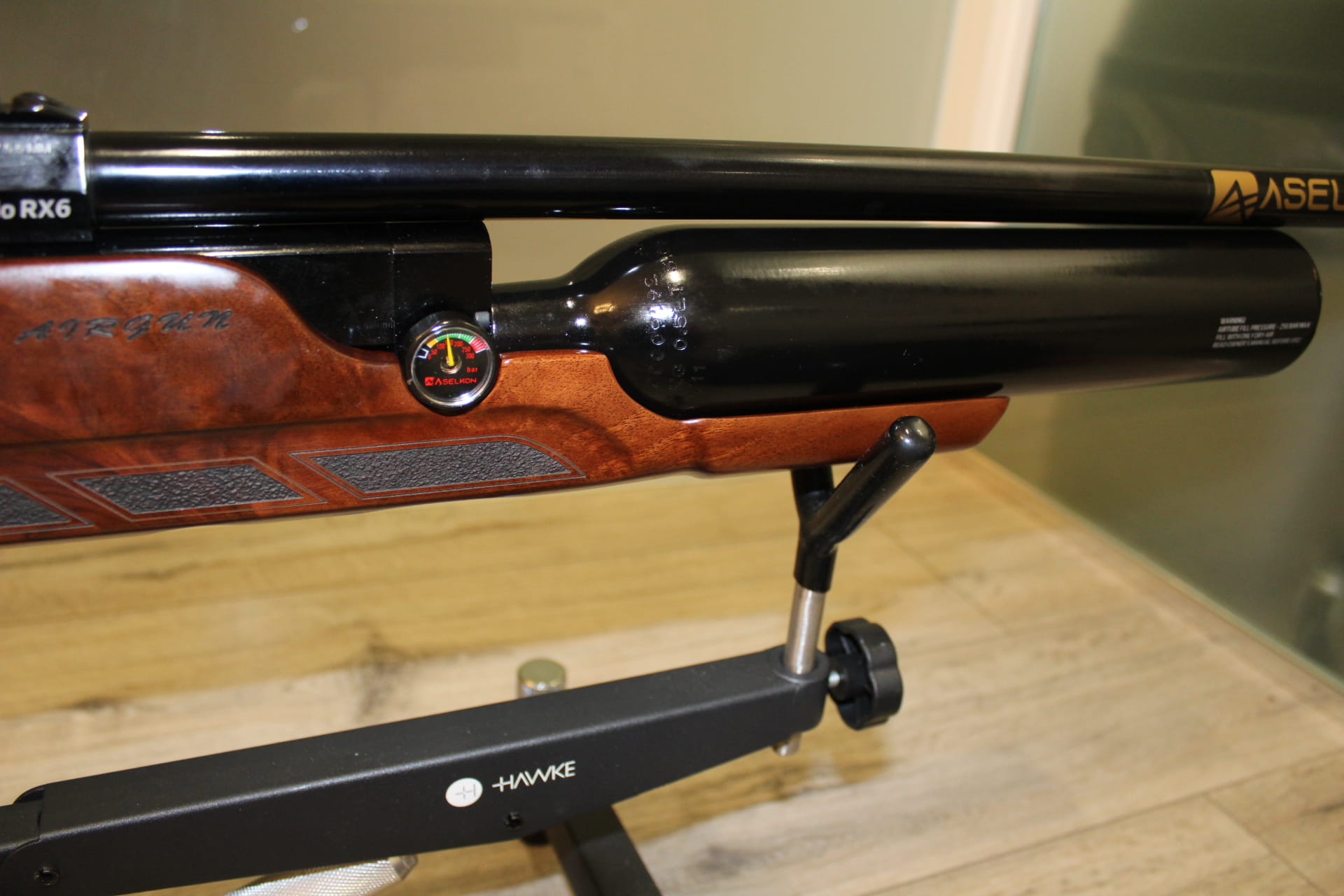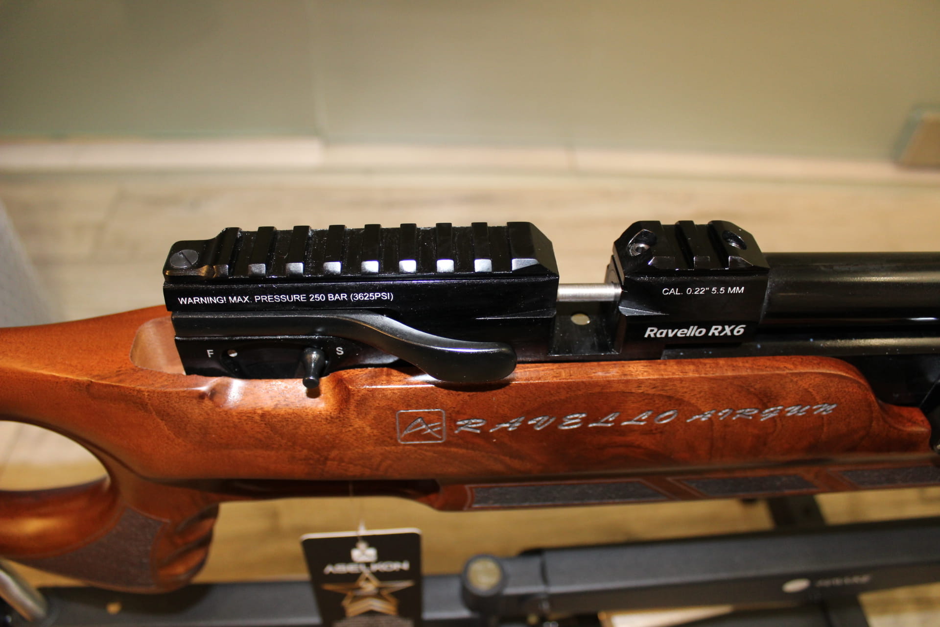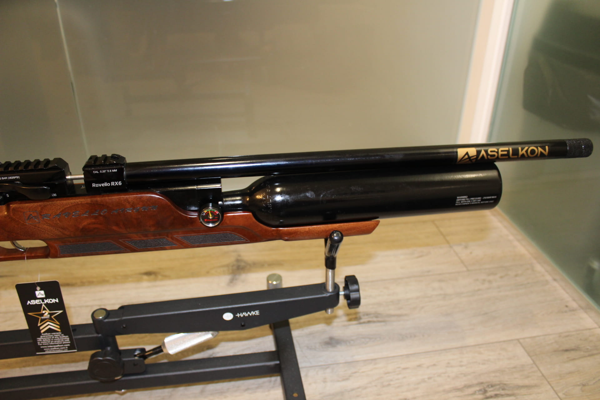 Aselkon Ravello RX 6 posiada 1/2 L butlę, która pozwala na oddanie ok 140 równych strzałów przy energii 17J Osada karabinka została wykonana z drewna orzechowego, wspaniale wykonana z chwytem pistoletowym, który zapewnia stabilność i wygodę podczas strzelania, specjalne bruzdy wyprofilowane na palce.