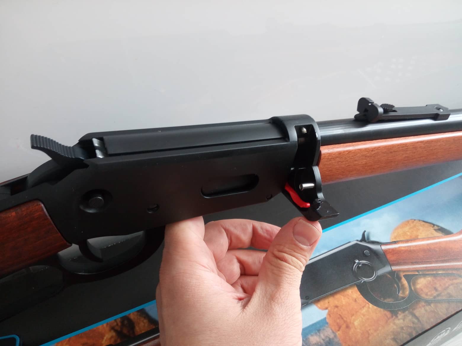 Nad spustem znajduej się kołkowa blokada odcinająca dostęp kurka do zaworu gazowego. Bezpiecznikiem samoczynnym jest kurek przerzutowy umożliwiający oddanie strzału dopiero przy pełnym ściągnięciu spustu. Lever Action wyposażony jest w mechaniczne przyrządy celownicze - stałą muszkę i regulowaną szczerbinkę.